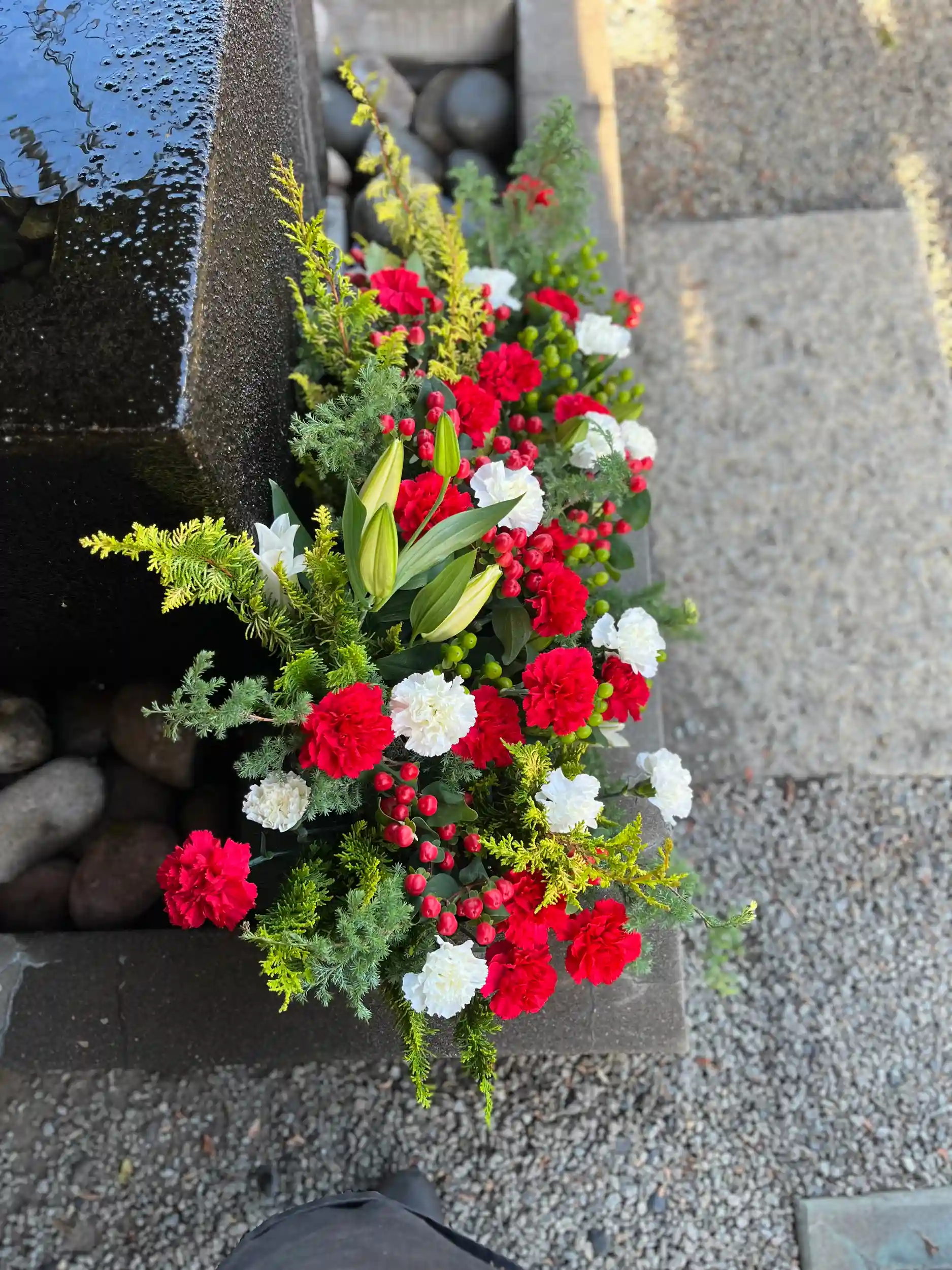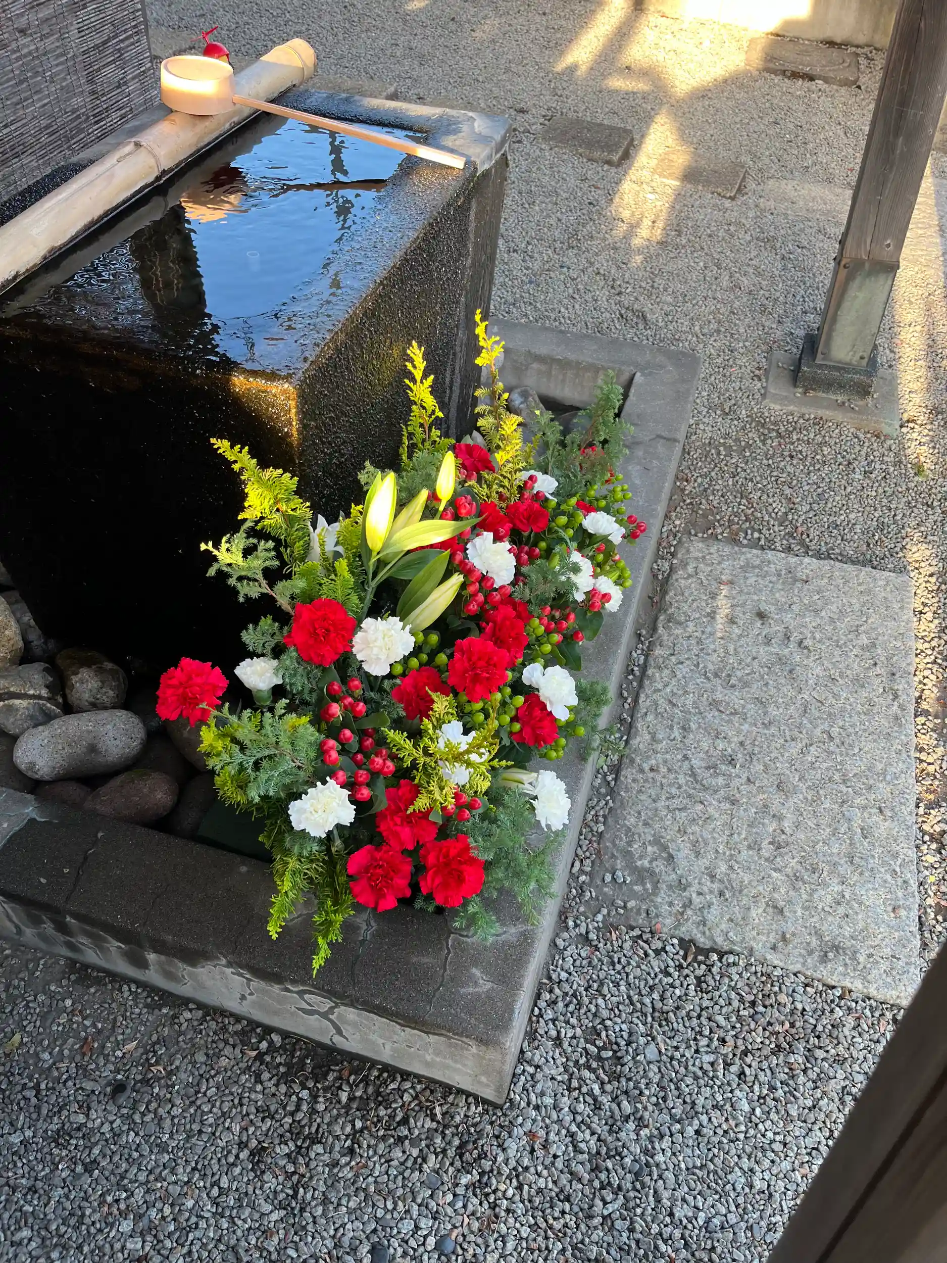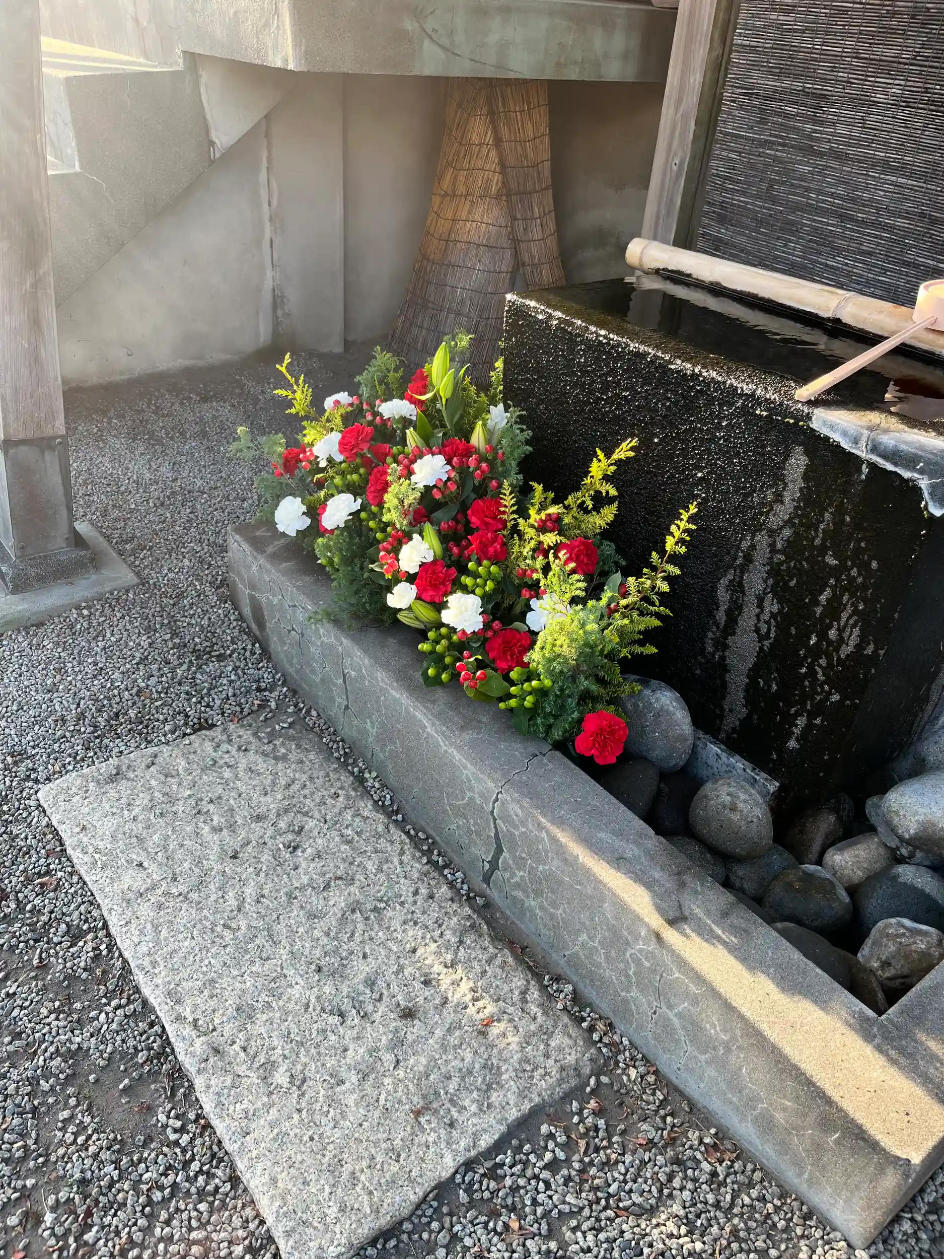 手水舎のお花の飾り付けをいたしました。
