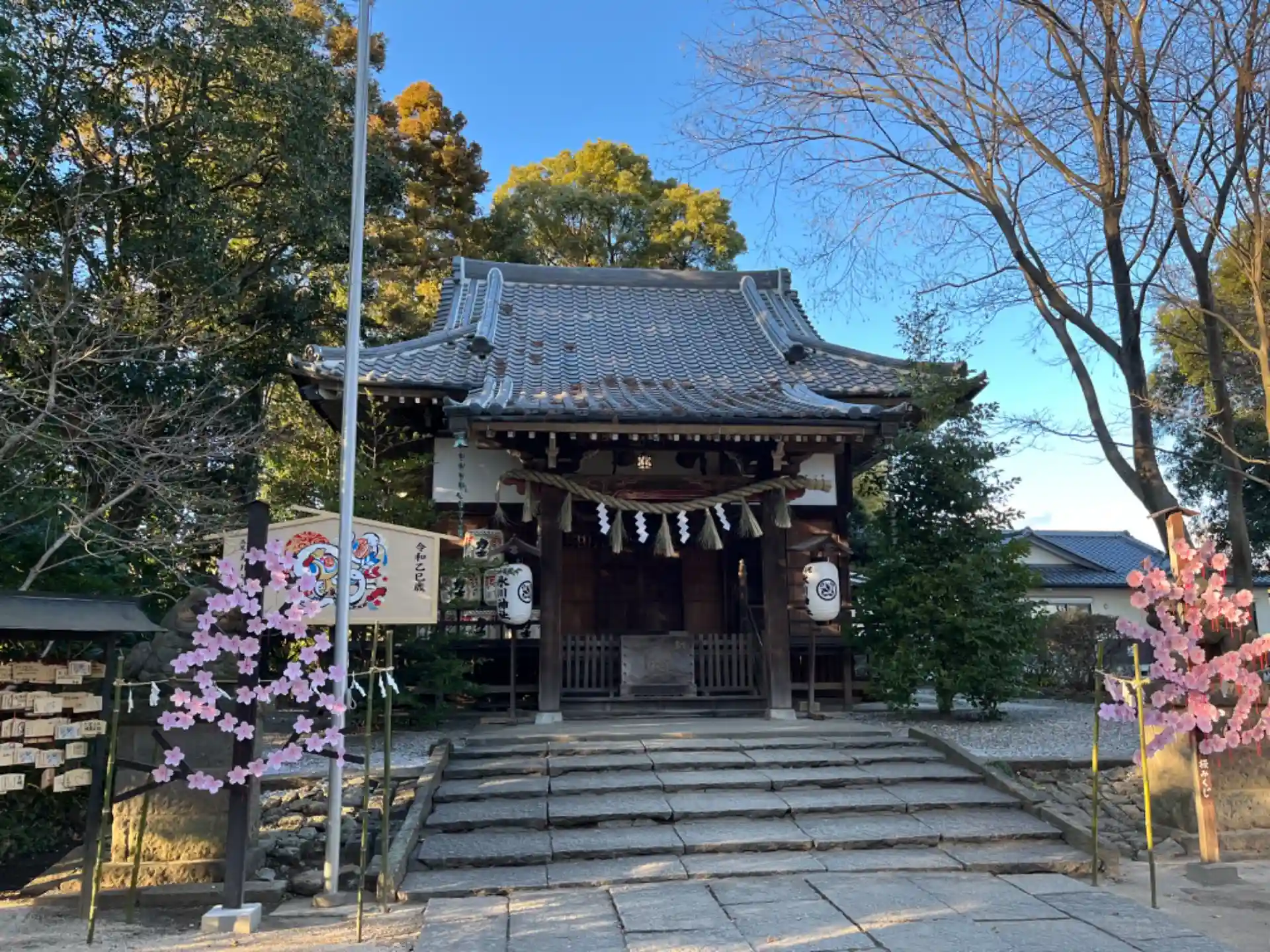 拝殿、手前の桃色の花のようなものはおみくじを花びらのように見立てたものです