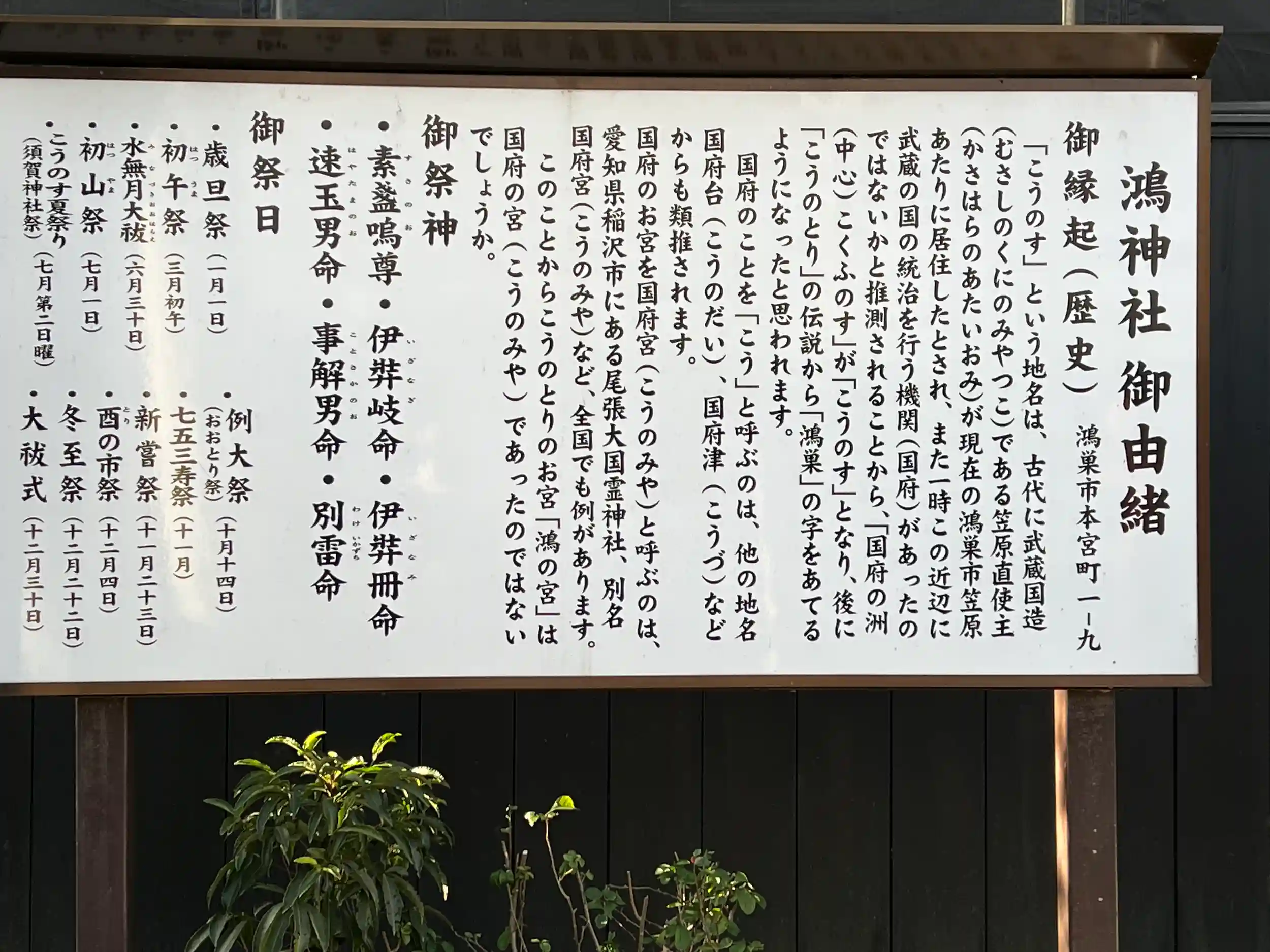 1873(明治6)年9月24日、鴻巣宿に鎮座していた氷川社・熊野社・竹ノ森雷電社が合祀された「鴻三社」が始まりである。