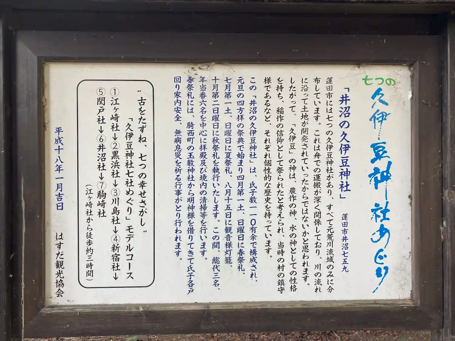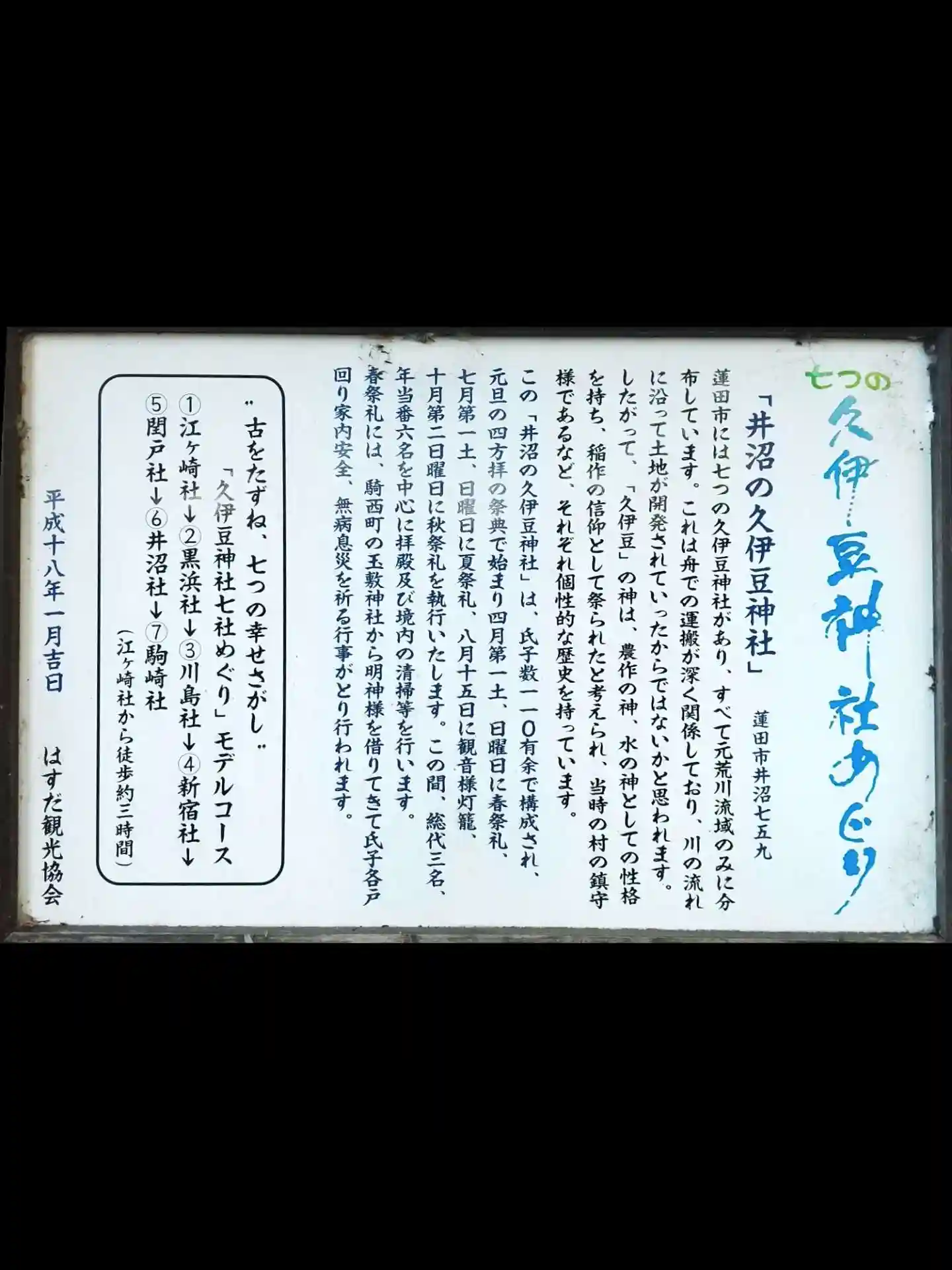 | ご祭神 | 《合》田毘古神,建速須佐之男神,加具土神,市杵島姫命,《主》大己貴神 |