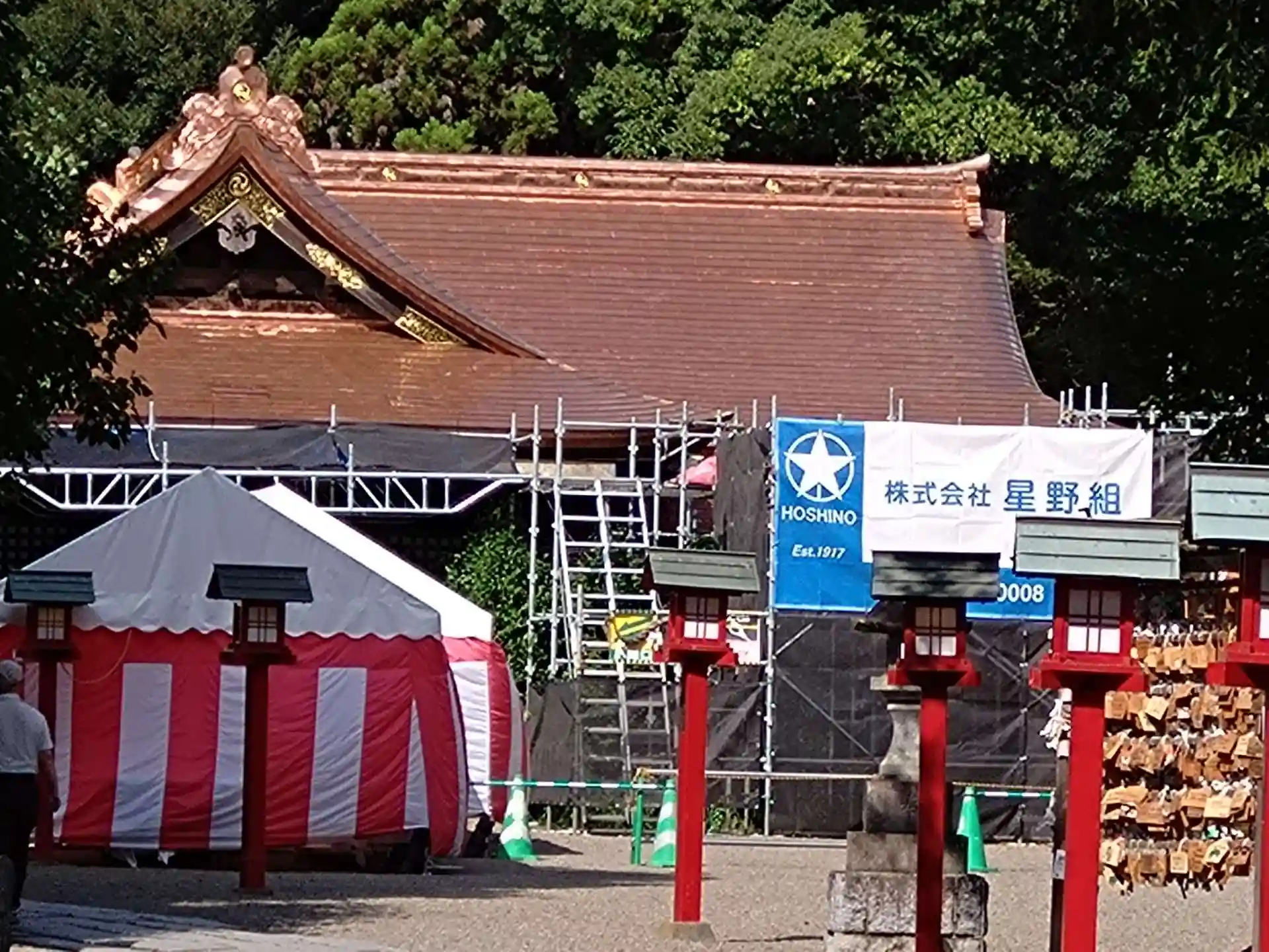 拝殿の方の足場がはずれてました。銅板が新しくキレイになってましたね。ピカピカです。多分、2、3年のうちに緑青で緑色になるんでしょうけど、その変化なども紹介出来たらいいですね(*^^*)