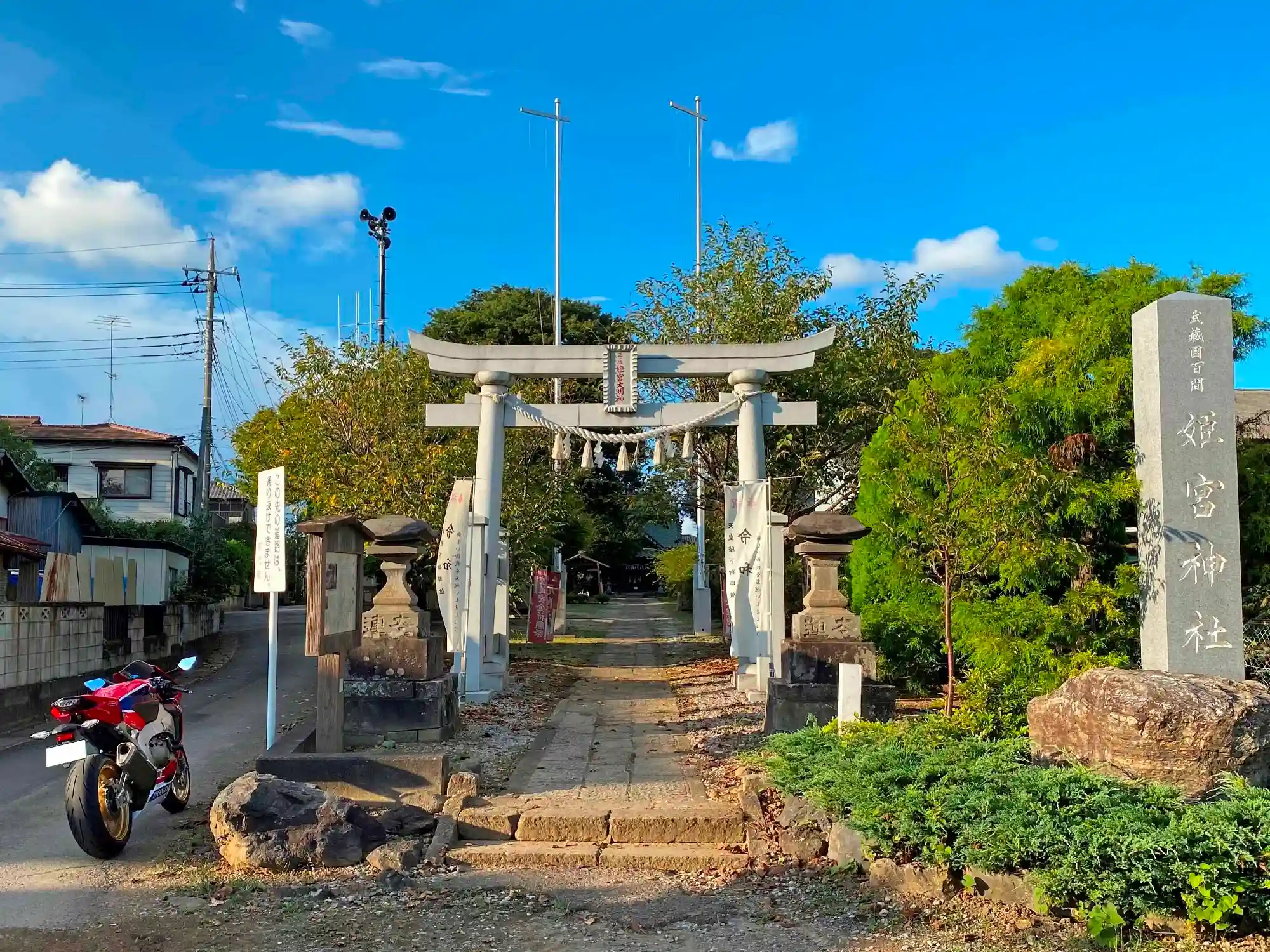 当社は、東武伊勢崎線・姫宮駅の北1kmの平地、伊勢崎線の線路の近くの、耕作地が広がるのどかなエリアの住宅が少し集まった場所にある。境内は南北に細長く、敷地内には集会所があり、<ザ・村の鎮守>といった感じ。社殿の近くには古墳があったりする。
