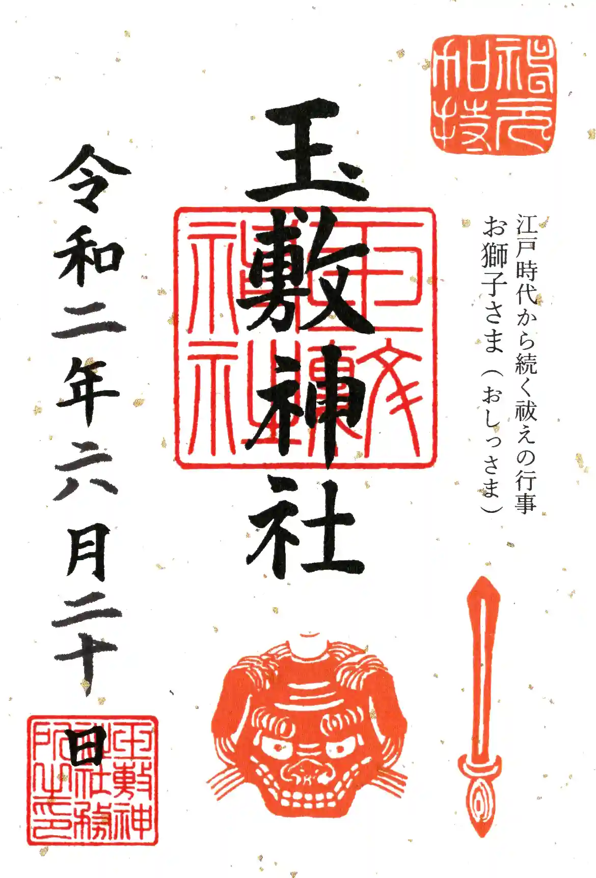 現在(6/20)、玉敷神社の神苑の玉敷公園と旧河野邸では、紫陽花が見頃を迎えています。参拝を兼ねてちょっとしたお散歩にはよろしいかと思われます。御朱印は「お獅子さま」が配された限定御朱印がありましたのでいただいてまいりました。こちらは揮毫のものではなく、印刷のものになります。