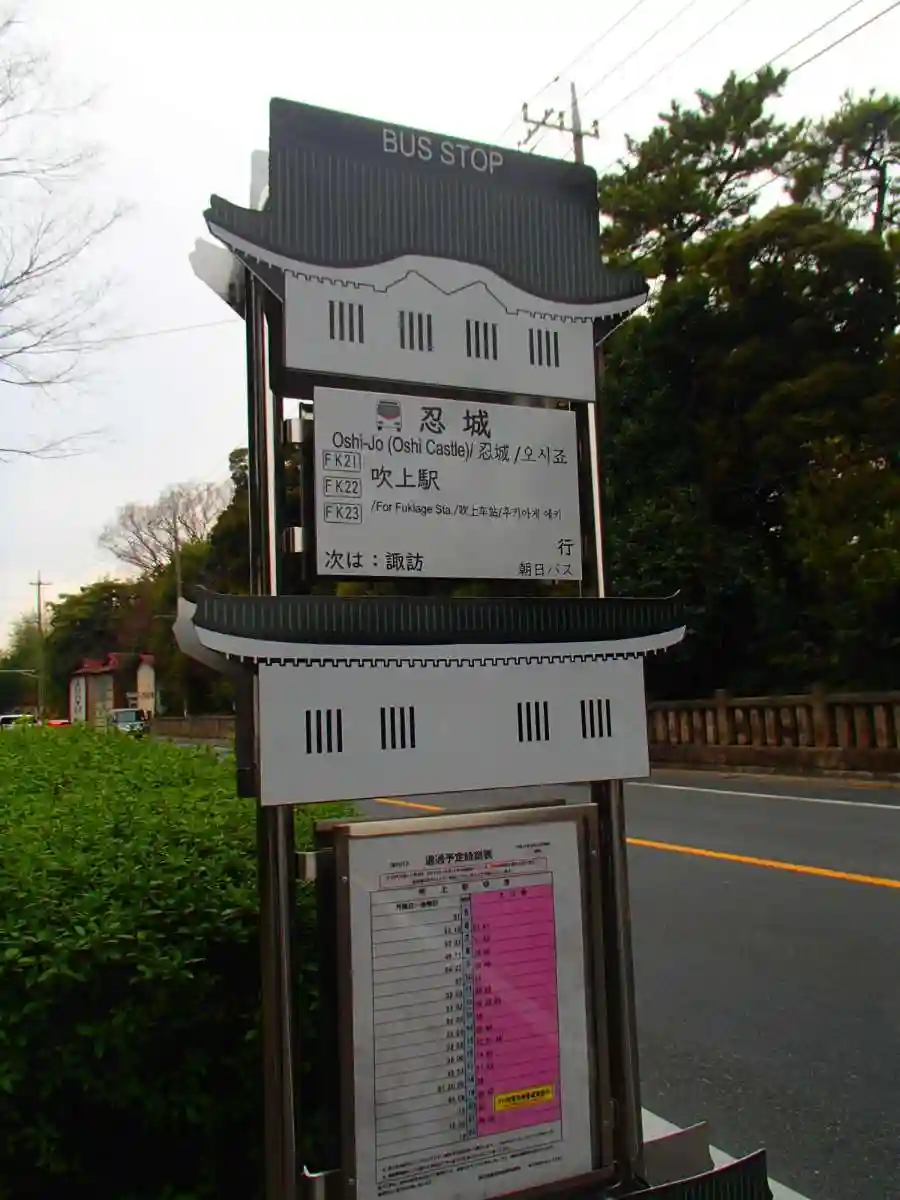 目の前のバス停。忍城の形になってますね。