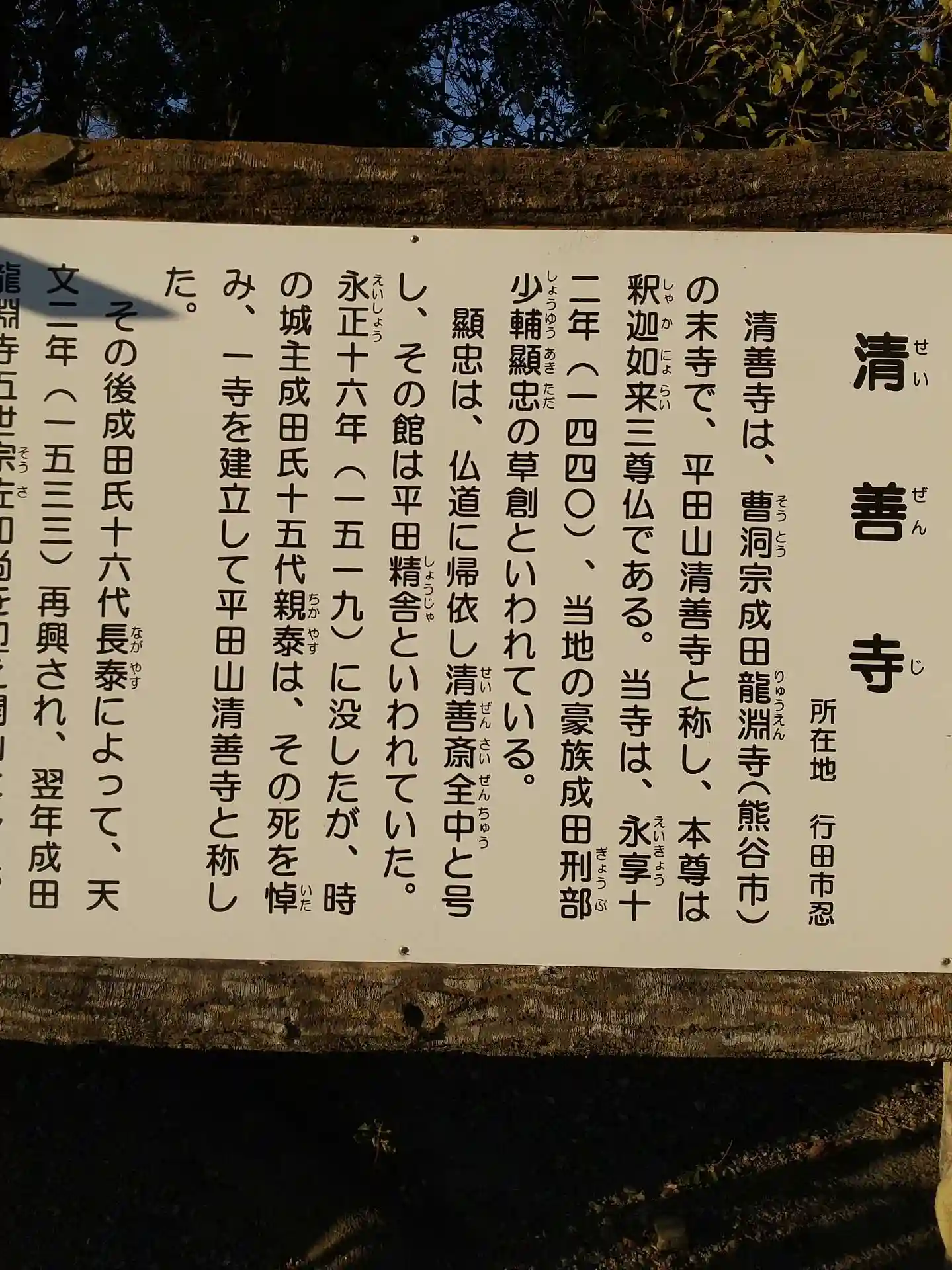 成田刑部少輔顯忠は永正16年(1519)に没したが、時の城主成田氏15代親泰はその死を悼み、一寺を建立して平田山清善寺と称したといいます。