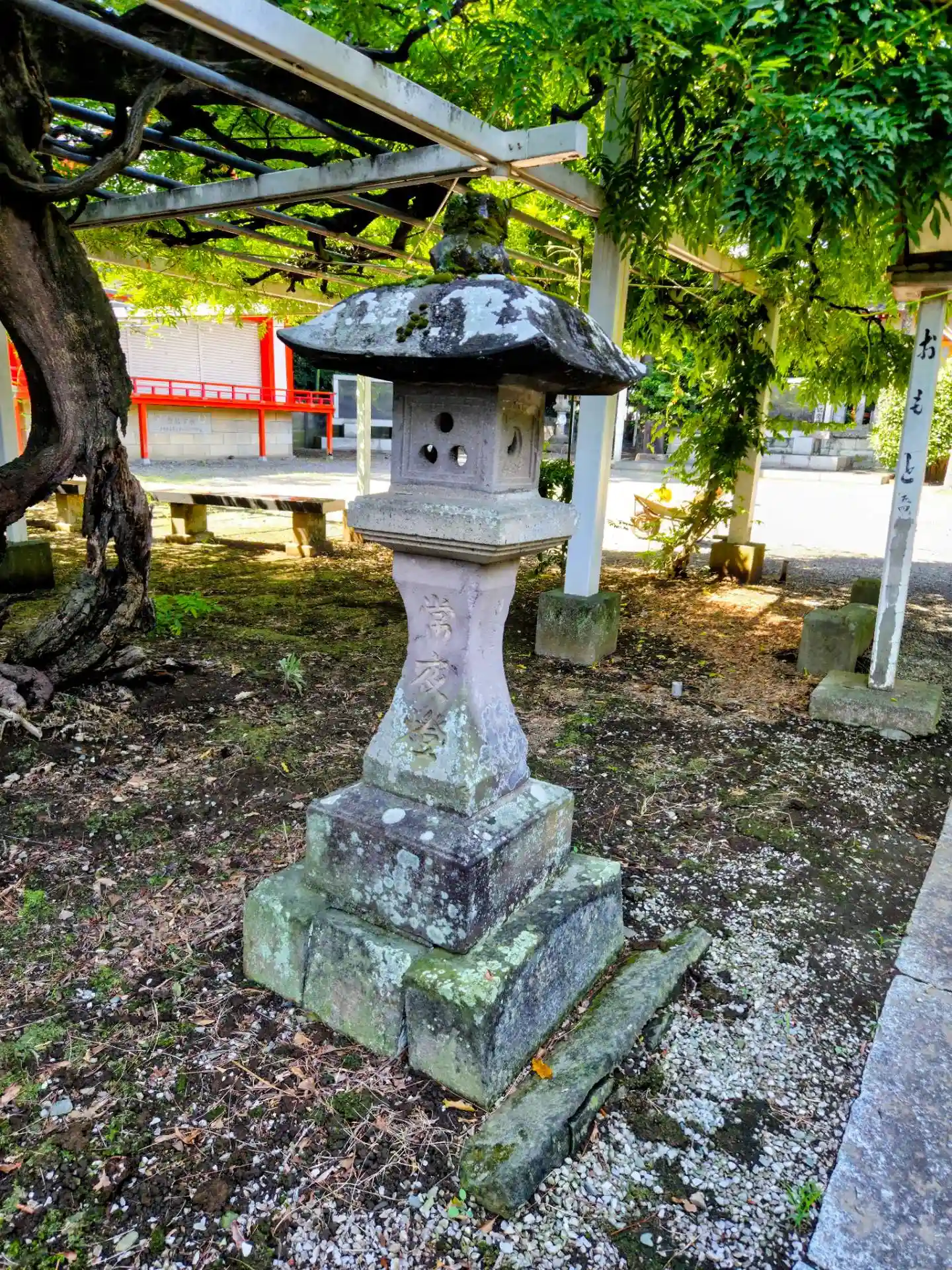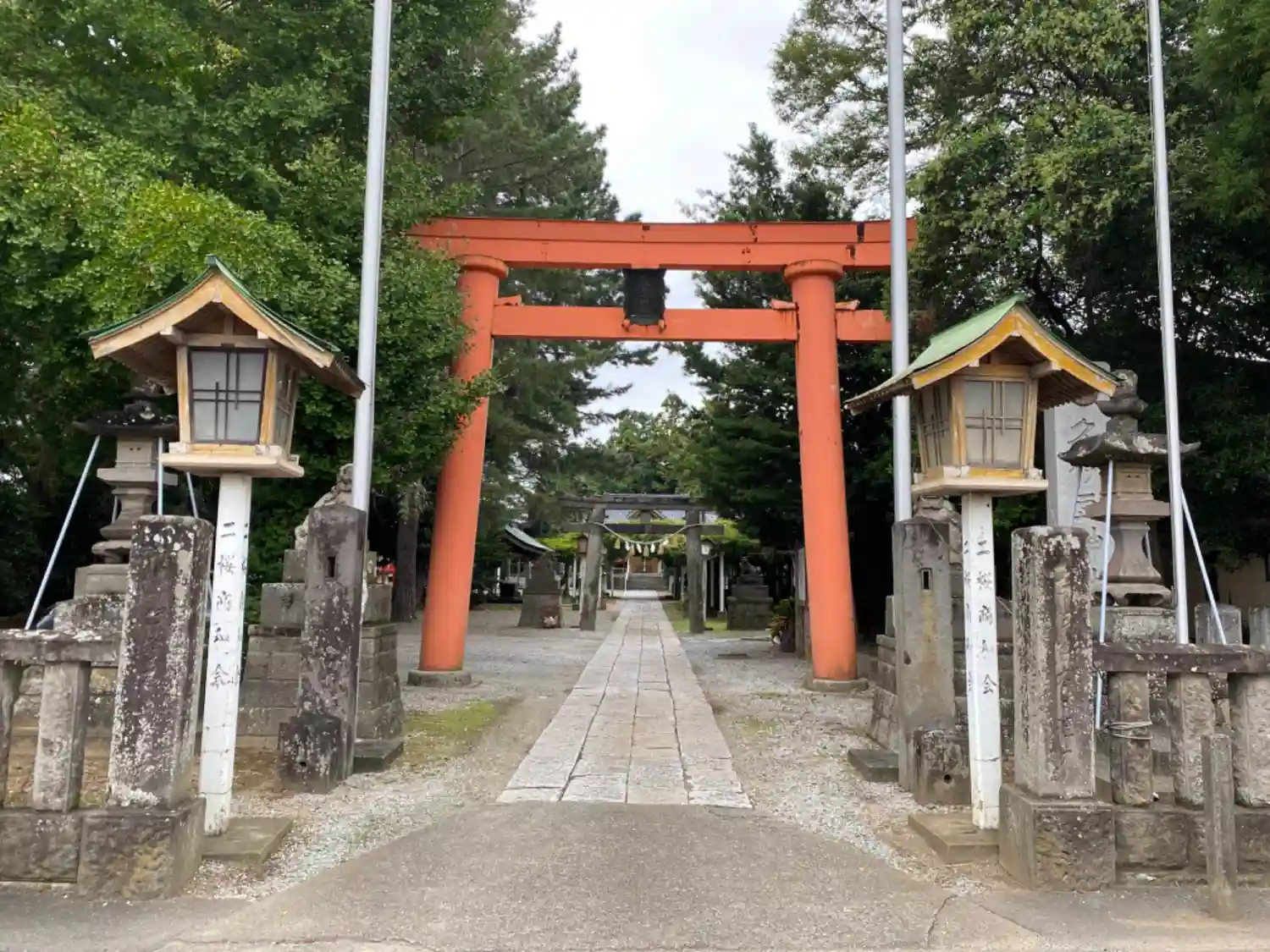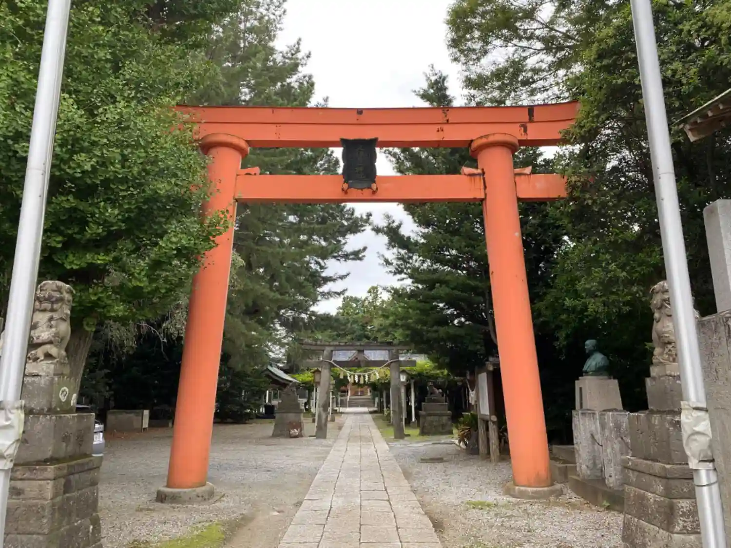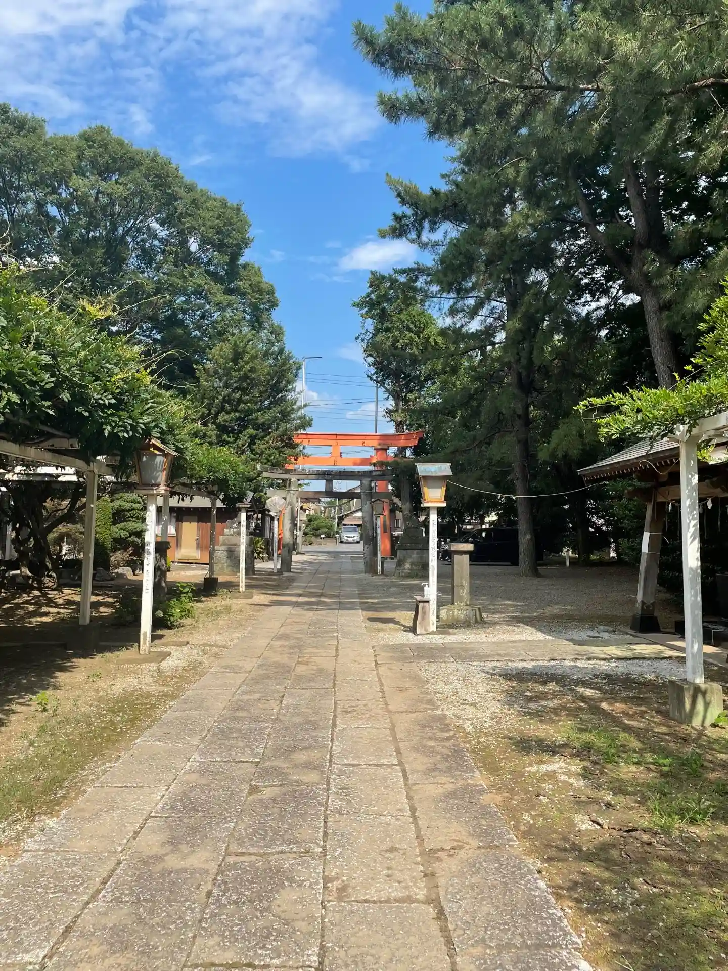 二の鳥居は石造りです。参道から見えるのは藤棚です。コチラの神社の藤棚はとても立派で、藤の時期に是非お立ち寄りください。行田の有名な藤棚です。