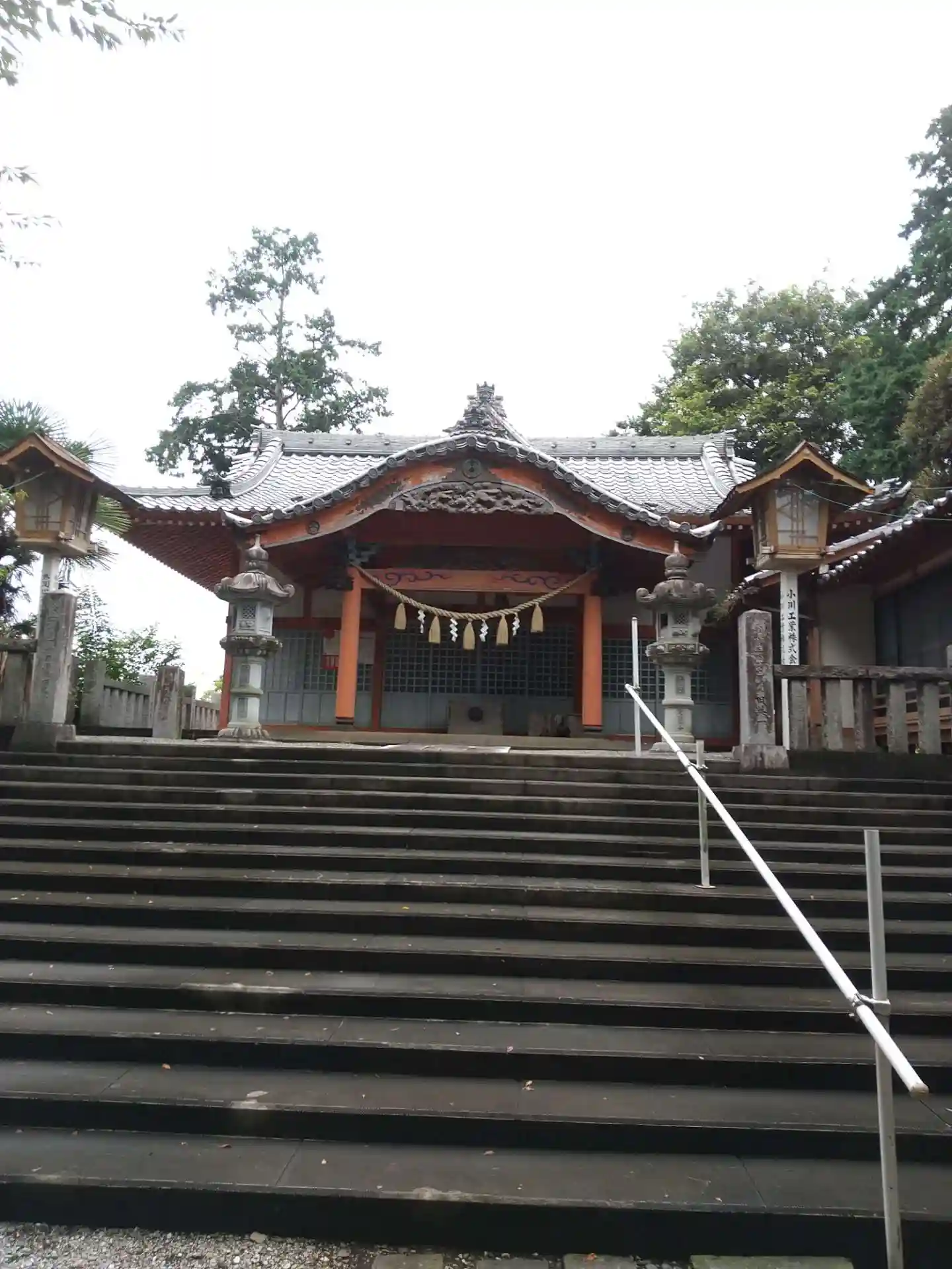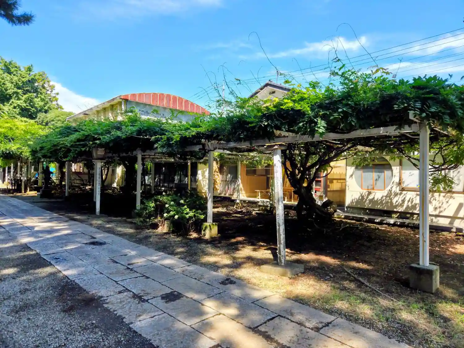 参道です。右手には久伊豆神社からの回廊があるんですが、今はさほど使われていないようです。敷地内には他に昭和の雰囲気が残る、二階建ての昭和レトロな建物があるんですが、4,50年前には結婚式に使われていたそう。日曜日には毎週5組くらいの式があったと神主さんが教えてくださいました。おそらくその頃の撮影スポットだったんでしょうね…とはいえ、神社から見える景色はお墓なんですが(笑)隣のお寺さんの敷地と接してますので。
