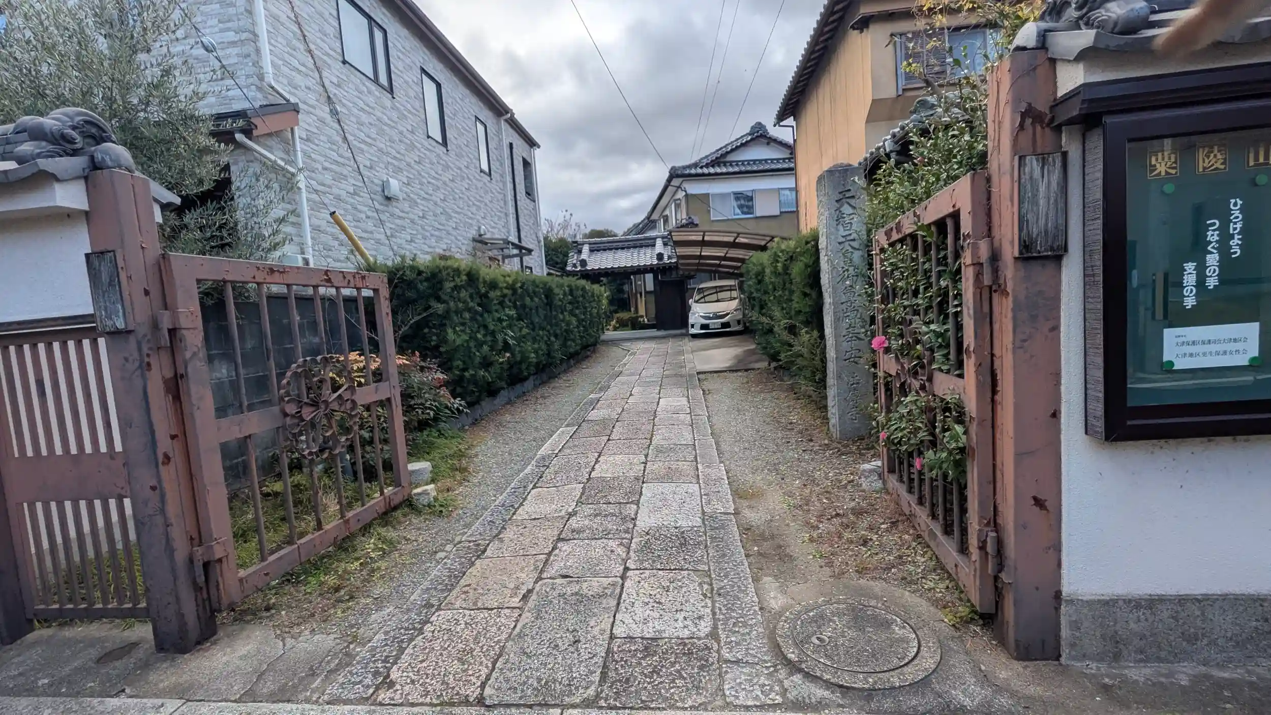 またしても仏光寺派寺院😲山門開いていたので本堂前でお詣りさせていただきました。参道口に「天智天皇御尊牌泰安」とあり、どうやら天智天皇が江国志賀郷に建立。基は尊信大法師で当所は三論宗という聞きなれない宗派で、護国山一乗院円明寺とのこと。のち大友皇子の子とつたえる大友与太王が当寺に帰依し現住職もその御子孫とのこと。天智天皇と大友皇子の尊碑を安置しているそうです。まあお目にはかかれないでしょうけど😅正和年中(1312~17)真宗仏光寺派に改宗し、ついで延元年中(1336~40)に法傳寺と改号とありました。