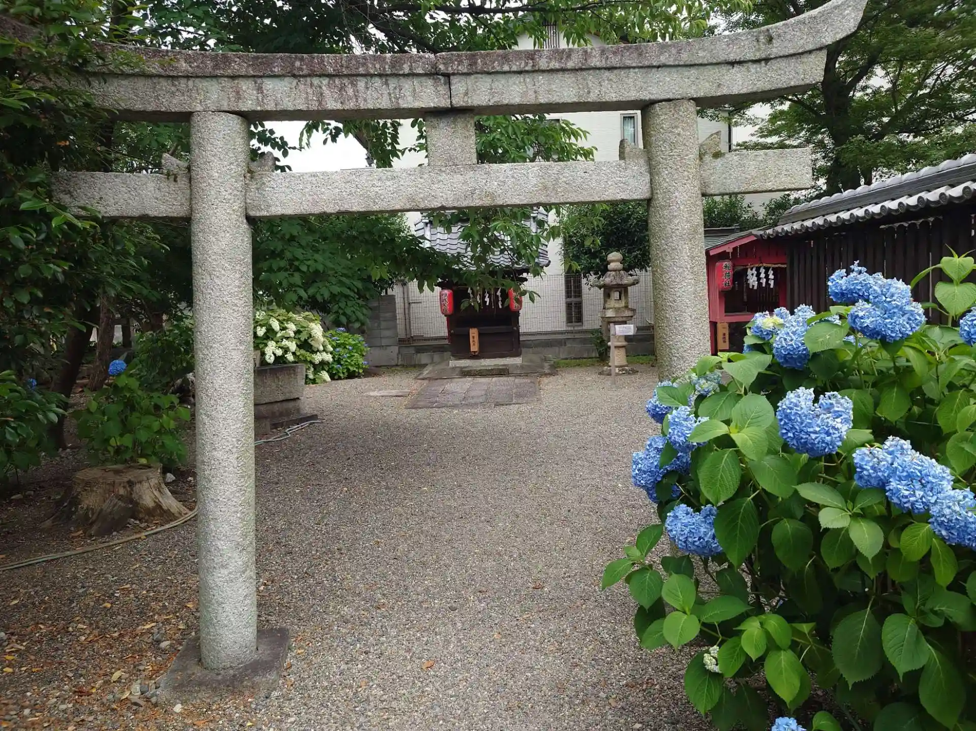 御祭神は淡海石坐大神で、更に東殿(本殿)の八大龍王宮に海神豊玉比古神(神武天皇御祖父神)・彦坐王(開化天皇第3皇子)、正霊天王宮に天智天皇(天命開別天皇)・大友皇子(弘文天皇)・伊賀宅子媛(大友皇子御生母)が祀られ、西殿(全国神社遥拝所)の天上将来宮に天神地祇、淡海龍王宮に淡海龍王神、福 徳 社に石坐七福神、氏 神 社に佐田彦神が祀られています。どうやら西殿は見落としたみたいです。社伝によると、瀬田に設けられた近江国府の初代国造・治田連がその4代前の祖・彦坐王を茶臼山に葬り、その背後の御霊殿山を、神体山として祀ったのが起源とされています。山には今でも祠があり、奥宮とされています。今回は奥宮へは行きませんでした。月次祭が丁度終わり、ご丁寧な御朱印を戴きました。入り入りお尋ねしたいことがあったのですが、お忙しそうだったので遠慮しました。豪華華美な神社ではなくむ、むしろ地味な神社ですが非常に興味深い神社でした。境内には紫陽花が植えられ丁度見ごろでした。