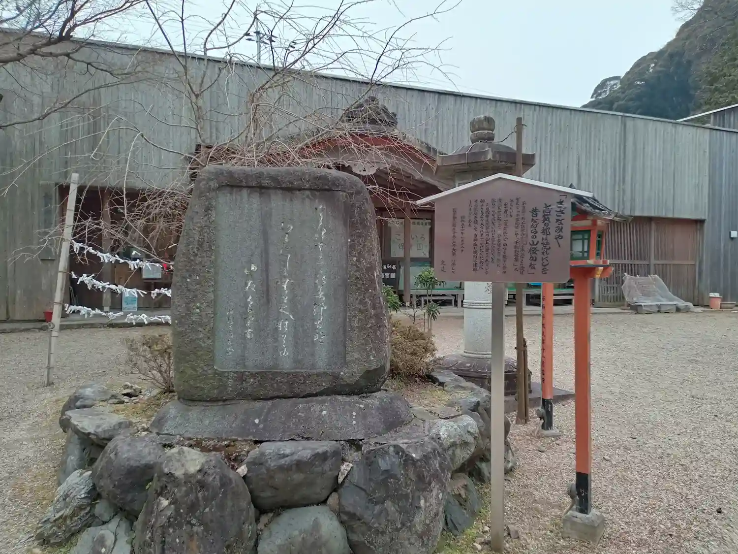 神門と神社名が記された石標