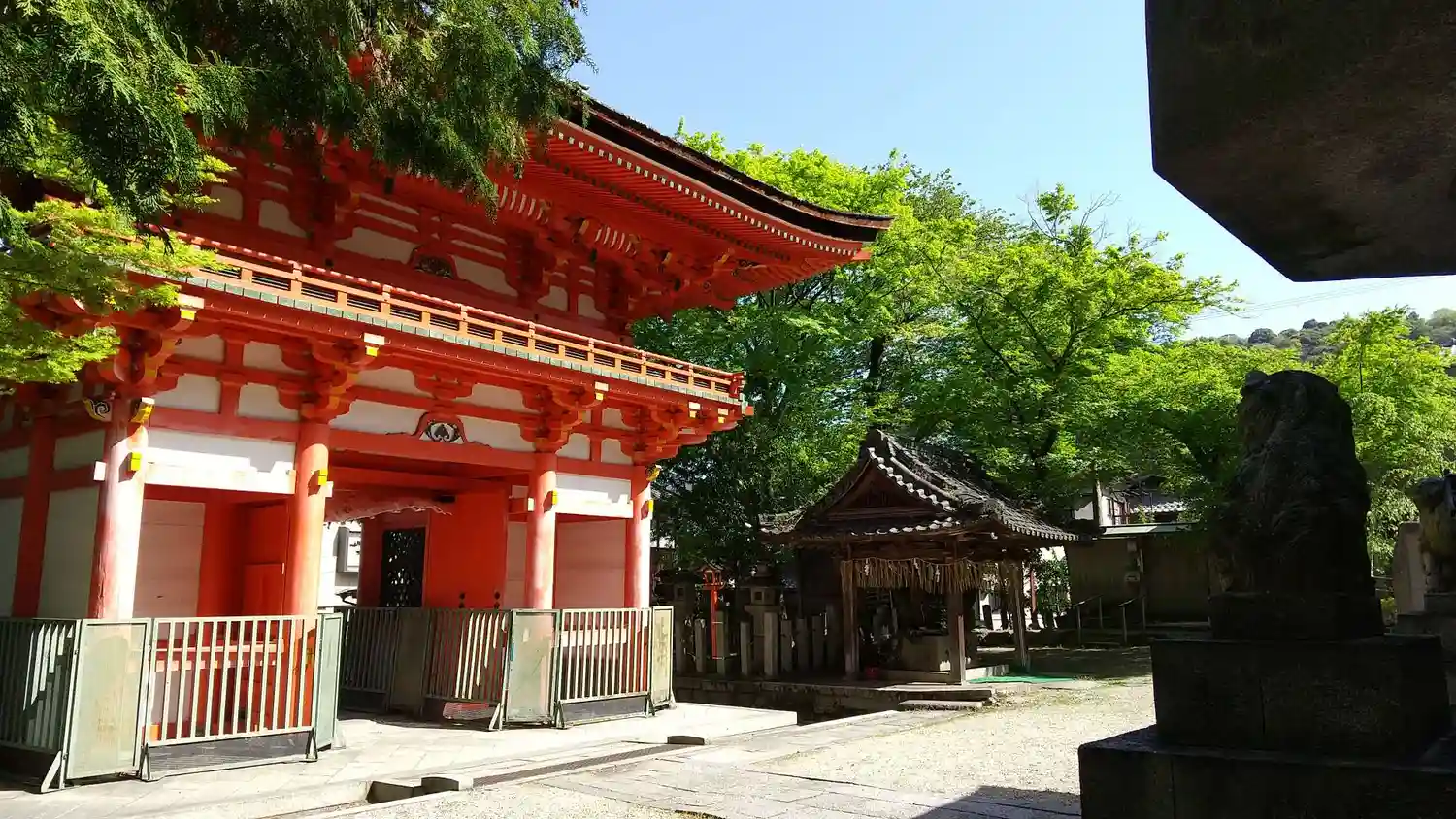 琵琶湖疏水を上から眺めながら、歩いていると赤い立派な楼門が見えて来ました。
