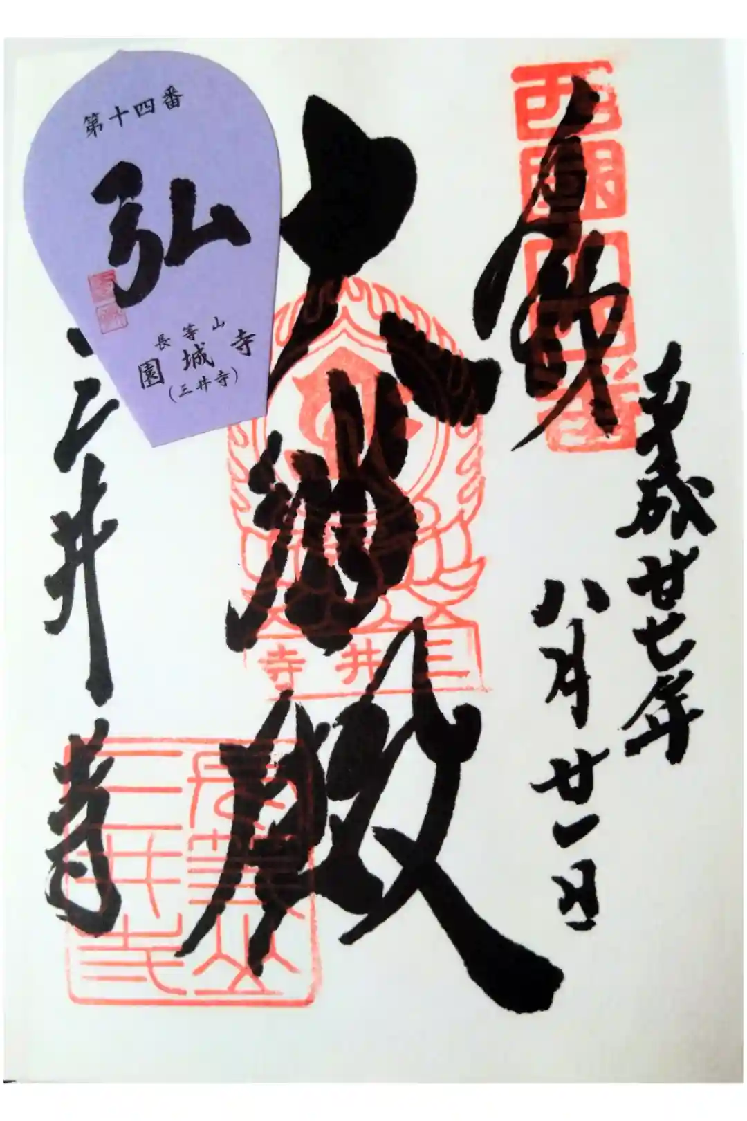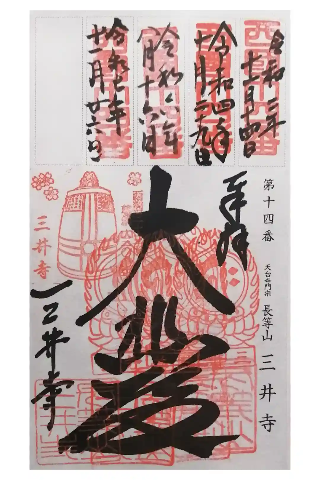 御詠歌「いで入るや 波間の月を 三井寺の 鐘のひびきに あくる湖」が書かれ、右上に西國十四番の印、真ん中に三井寺の文字が入った蓮華座に梵字(如意輪観音)の火焔宝珠印、左上に三井の晩鐘のイラストが入った西国三十三所草創一三〇〇年の三井寺記念印、左下に長等山三井寺の印が押されています。