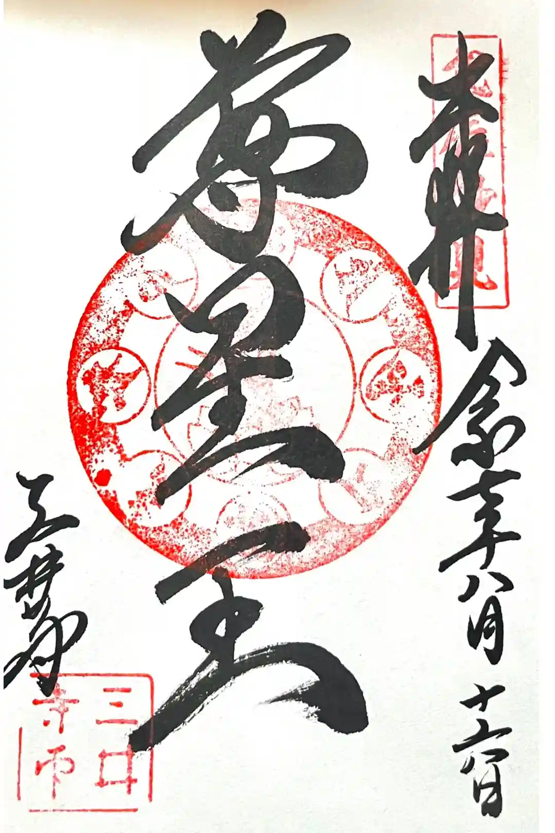 真ん中に智証大師と書かれ、右上に長等山の印、真ん中に「菊座橘の芯に十六八重菊紋」の印、左下に三井三井寺の文字、長等山三井寺の印が押されています。