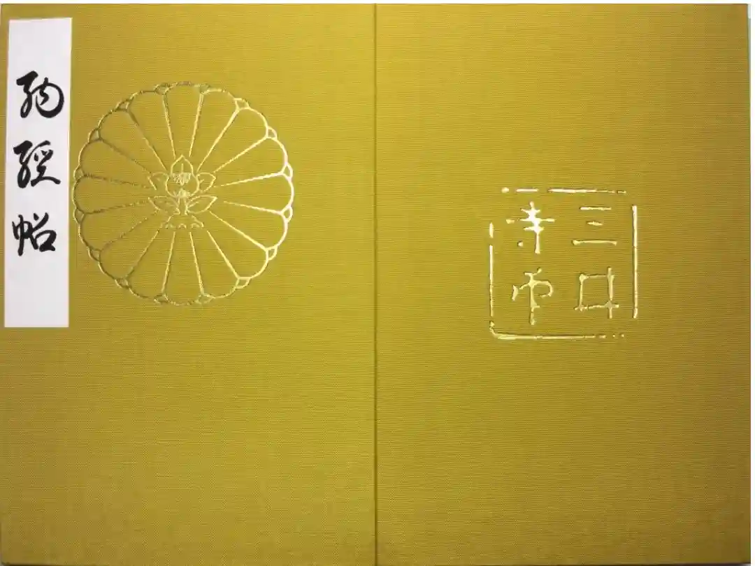 黄色の地に、表面は上部に「菊座橘の芯に十六八重菊」紋、左上に納経帖の文字、裏面は真ん中に三井寺の印章が入っています。