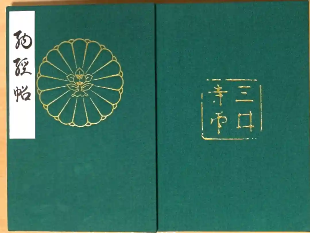 緑色の地に、表面は上部に「菊座橘の芯に十六八重菊」紋、左上に納経帖の文字、裏面は真ん中に三井寺の印章が入っています。