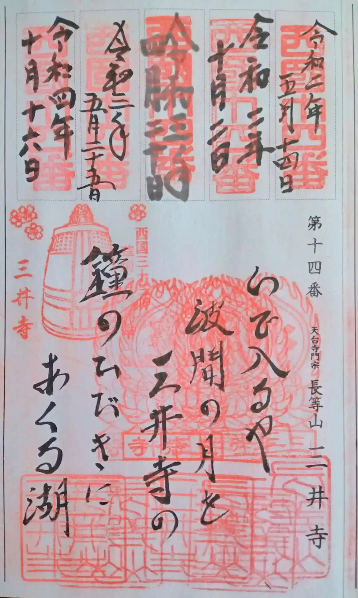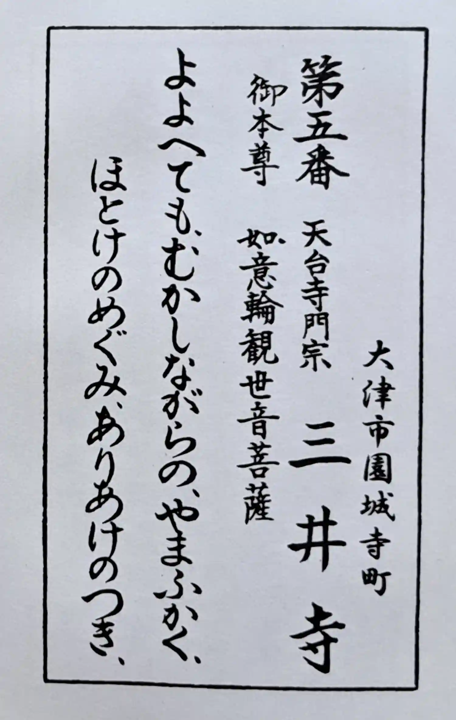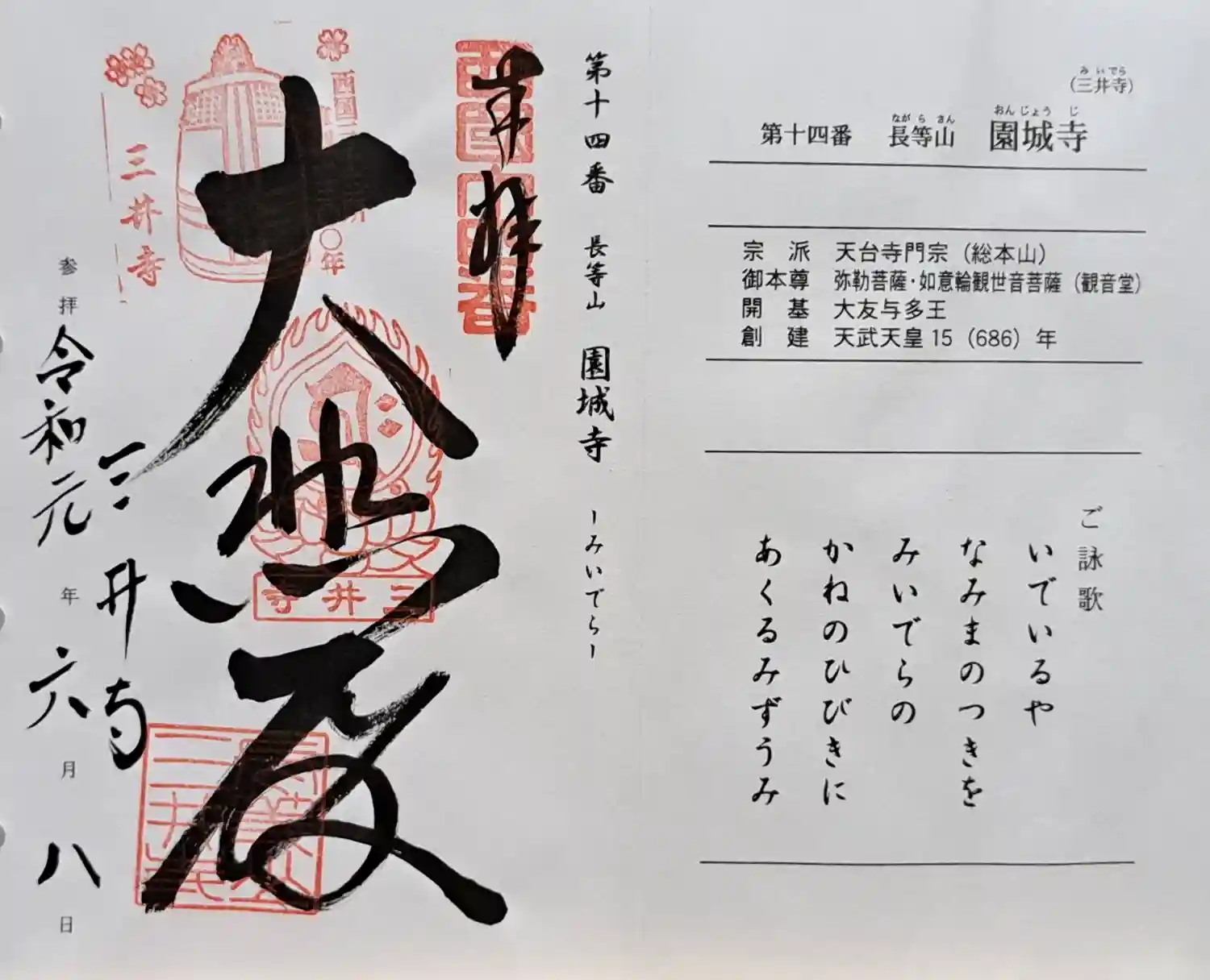 御詠歌【いで入るや 波間の月を 三井寺の 鐘のひびきに あくる湖】