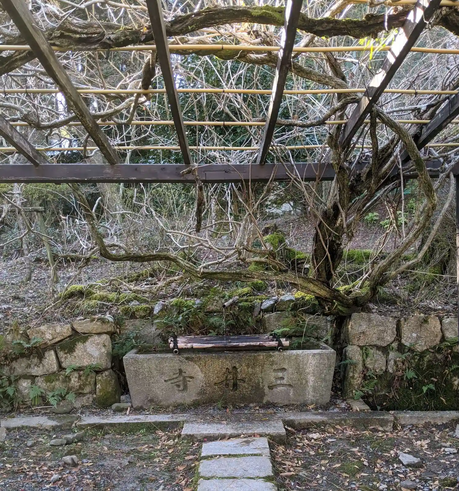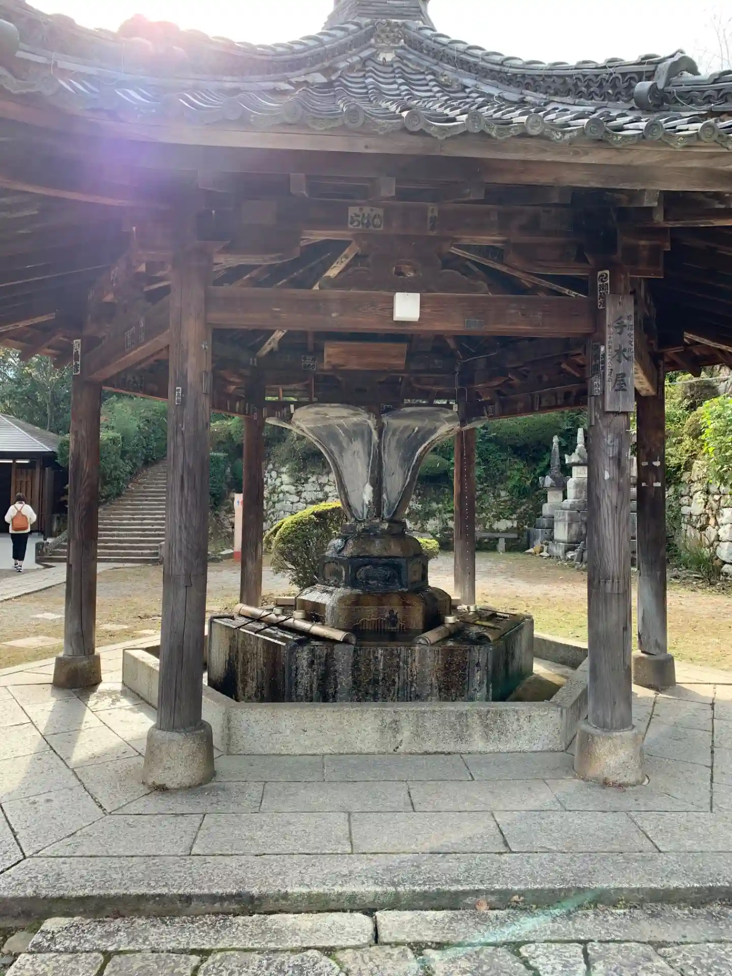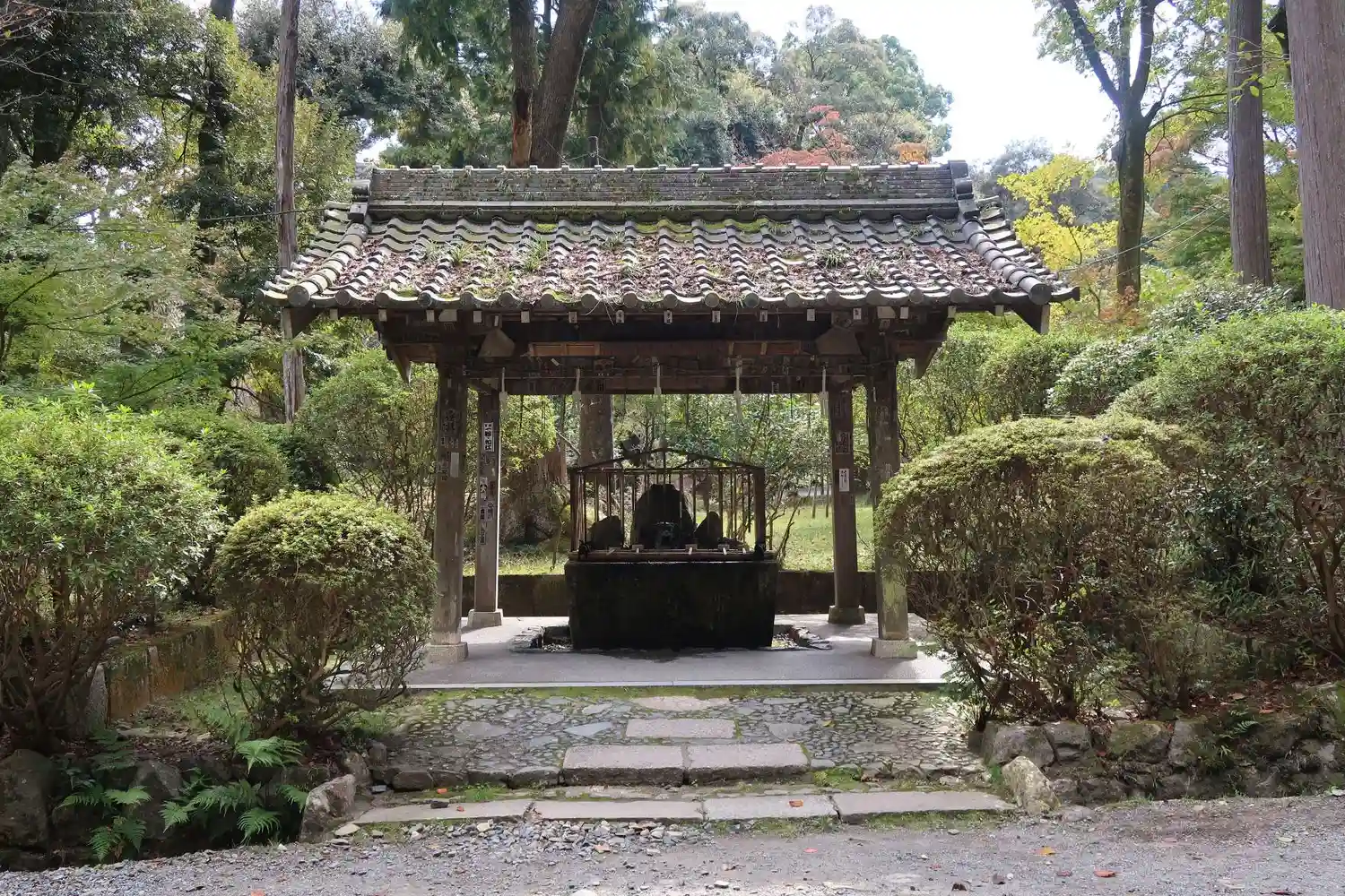 金堂脇にある閼伽井屋の中の岩組みから霊泉が湧き出している。