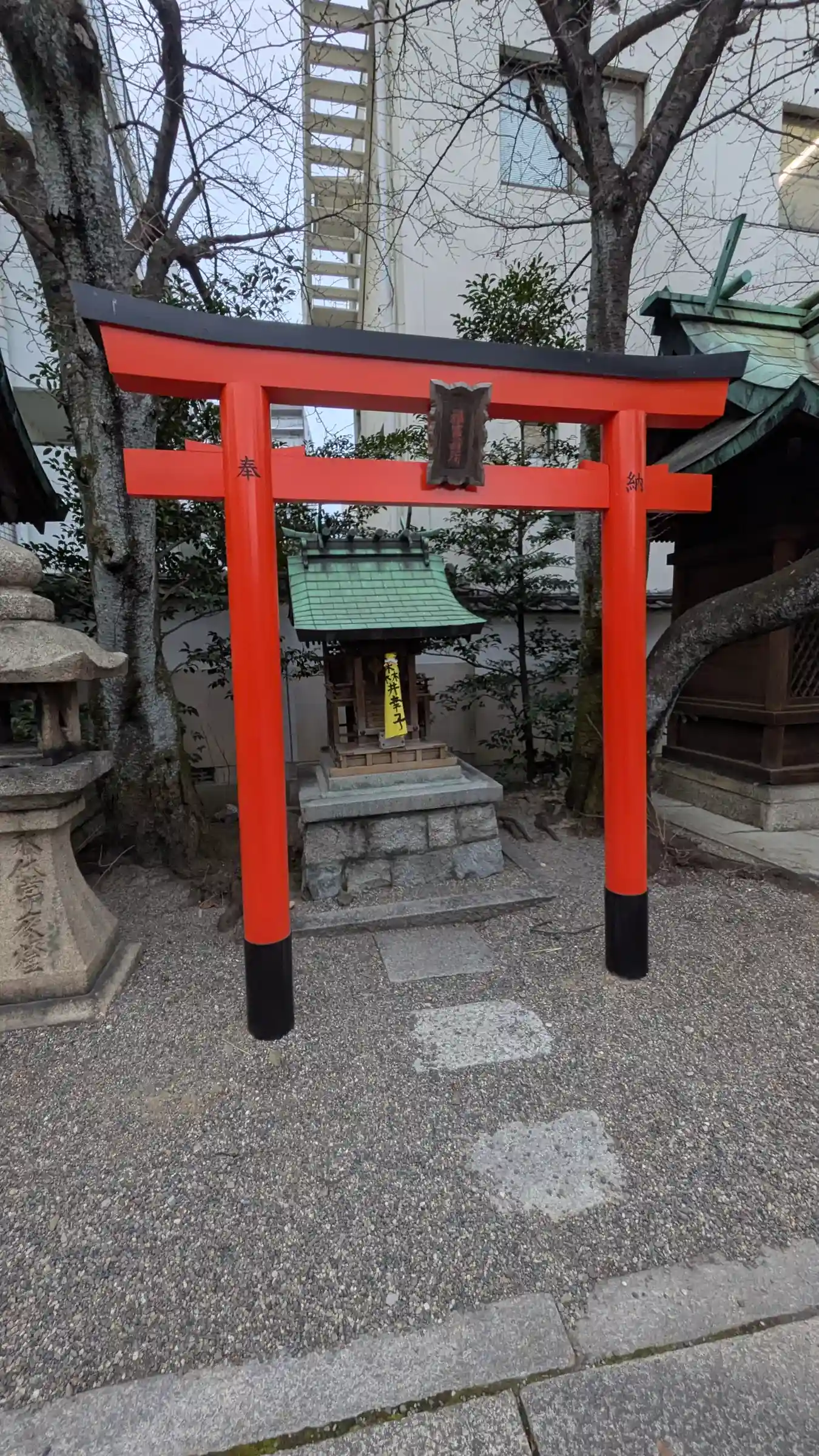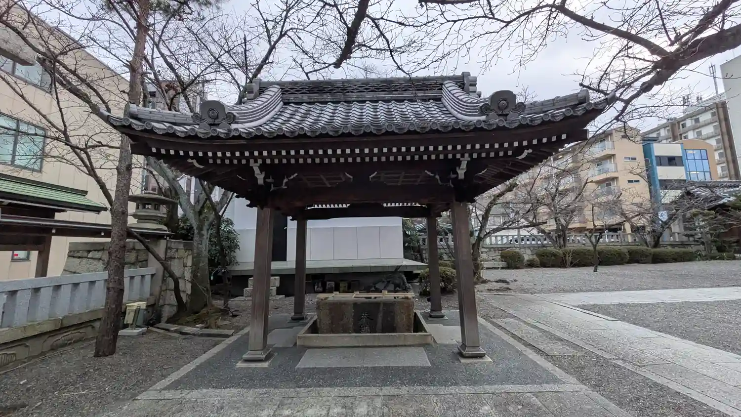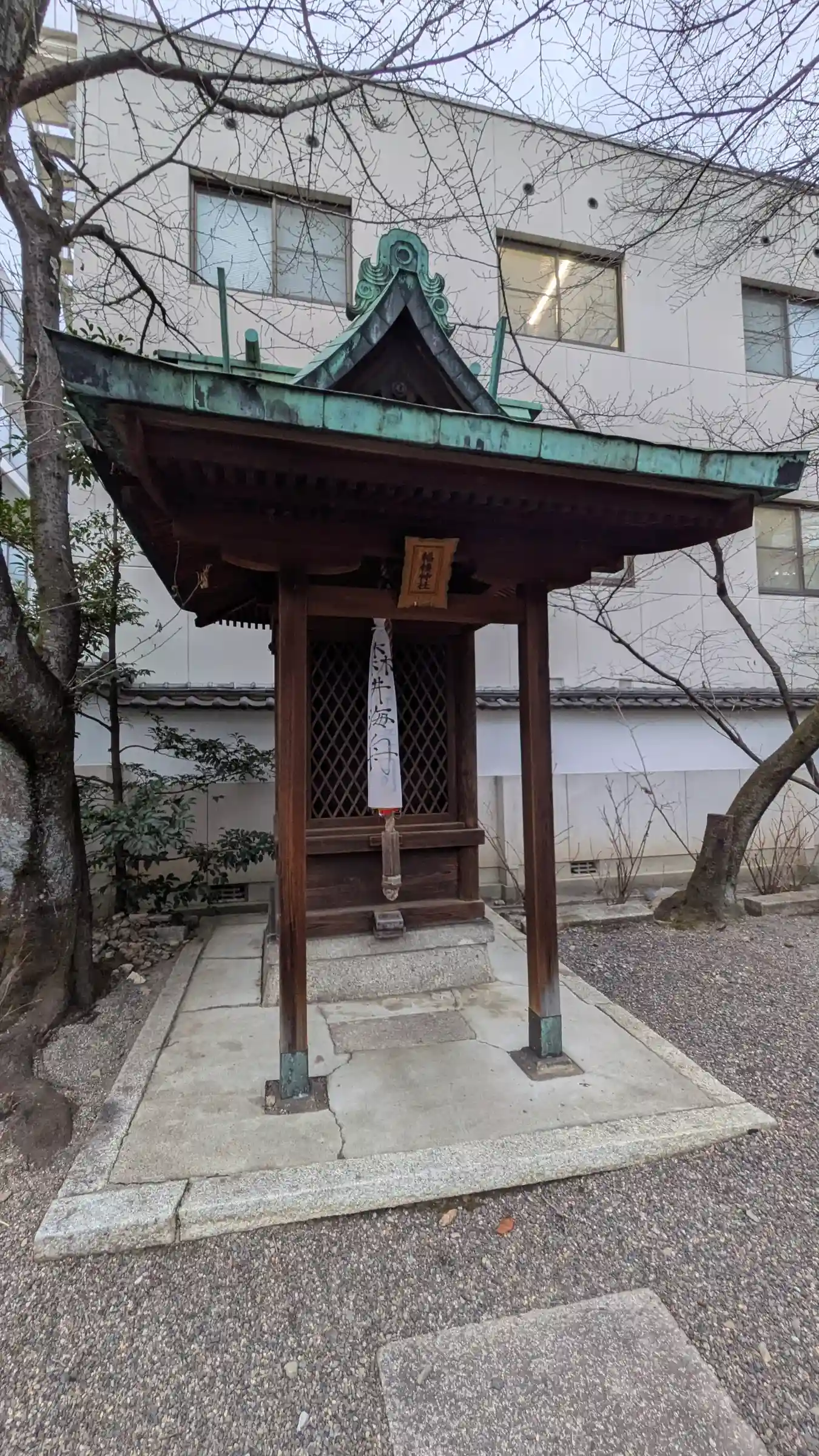 JR琵琶湖線「大津」駅から北へ徒歩で約8分ほど、近くには滋賀県庁やNHK大津放送局などが立ち並ぶ街の中に鎮座する神社です。