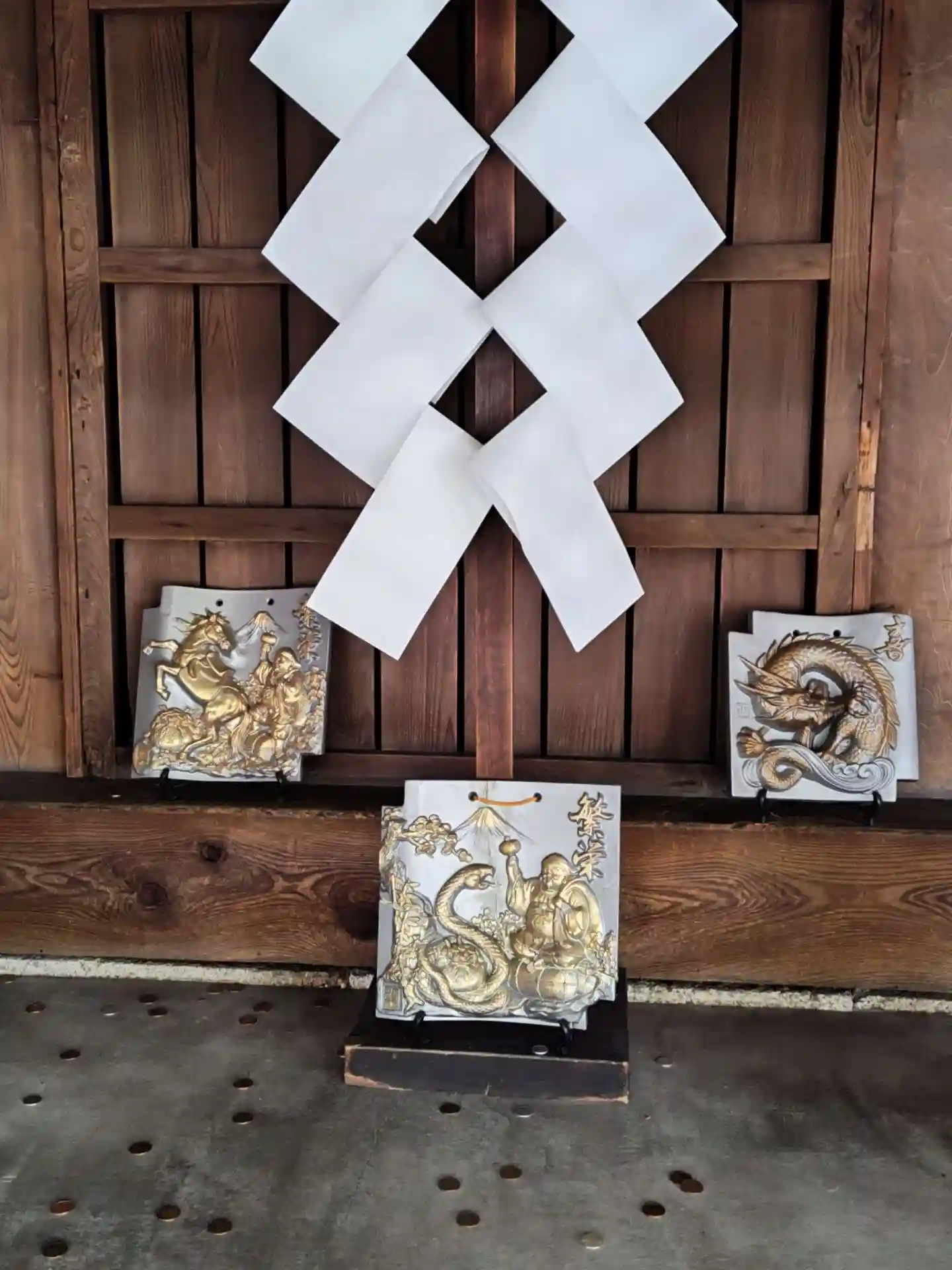 本殿のまわりは回廊になっていて、本殿後方にまわると縁起の良さそうな瓦が飾られていました