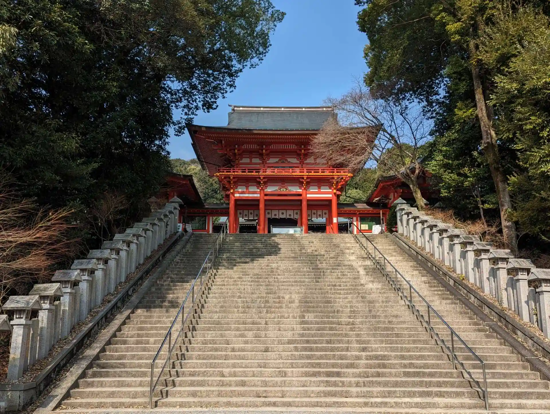 階段の下から見上げる朱色の山門✨これですね〜😍いろいろ散策した後は、百人一首大会会場である近江勧学館へー!ちはやふるです〜!