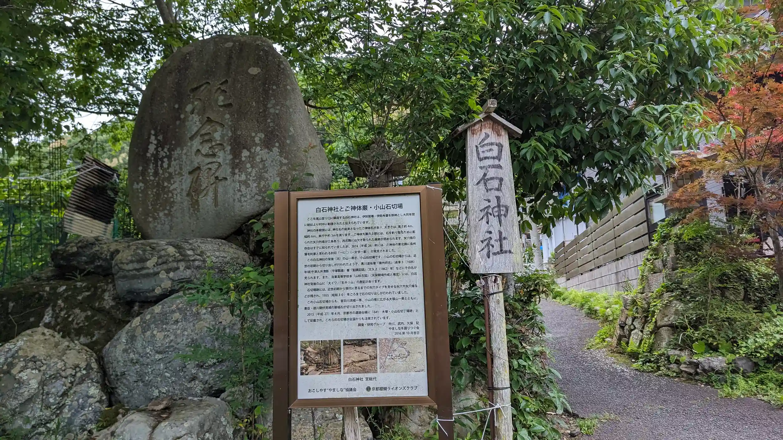 牛尾山参道手前に神社をお見かけしたので参拝。大きな白石があることから白石大明神として祀られたとか。磐座信仰の歴史を感じさせますが、その御神体である巨岩に石を割るため掘られた穴があるとのこと。「家康公が伏見城再建のため築城石として切り出そうとしたのではないかと推測されている」とあるがあの家康公がそんな罰当たりなことするかなぁ・・・?🙄まあこのあたりは石切場で有名な場所だったようでむしろ秀吉公のほうがやりかねん気もするが・・・😅
