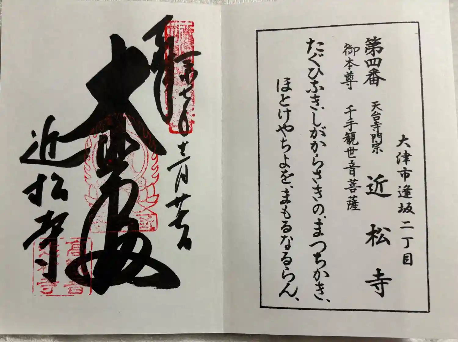 | 近江西国三十三箇所 第4番 | 仏さま:千手観世音菩薩 御詠歌: 類なき しがから先の 松近き 仏や千代を 守るなるらん |