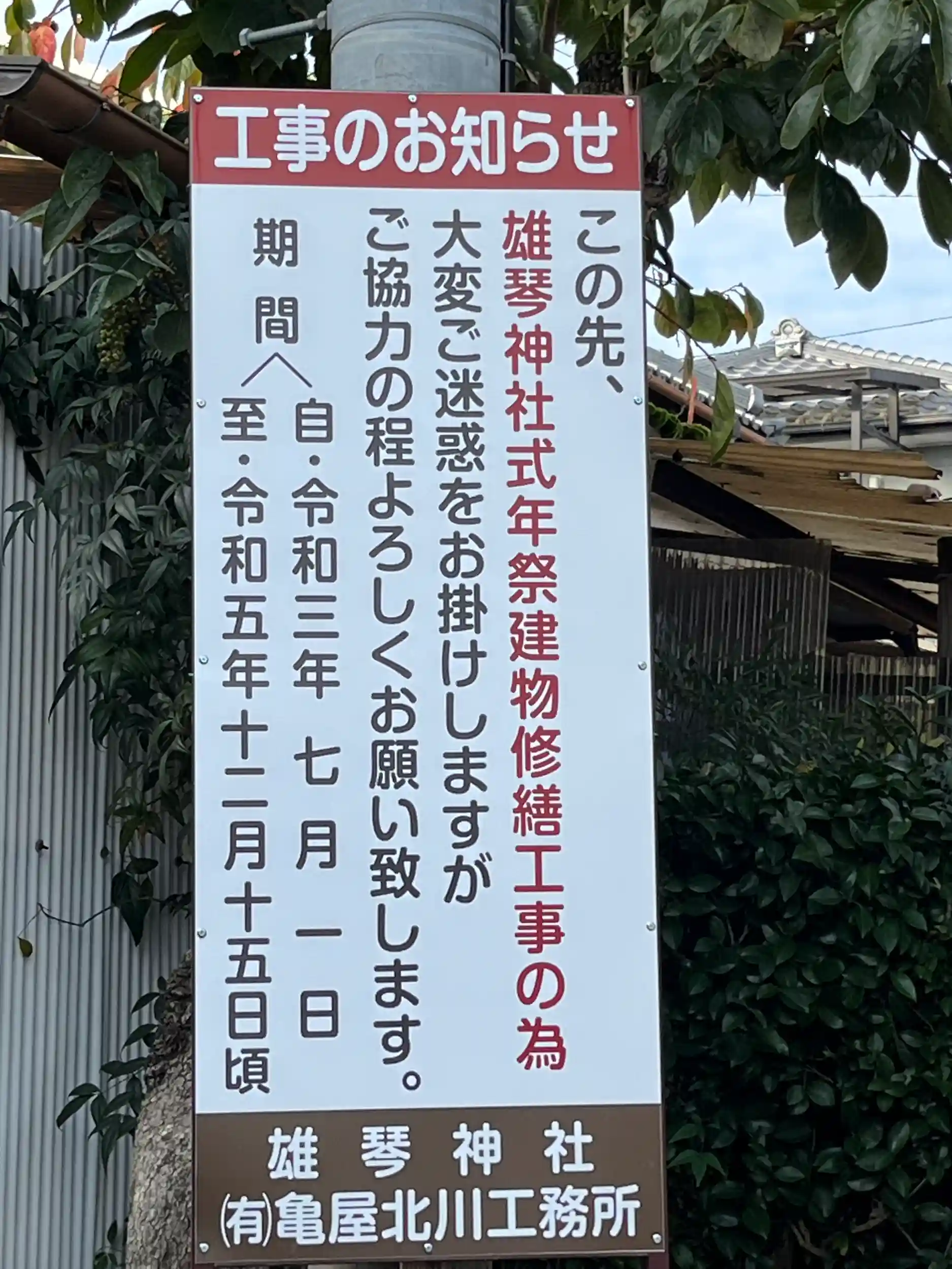 通りにある社号標の横にある、只今、御本殿式年祭建物修繕工事中⛏のお知らせ看板