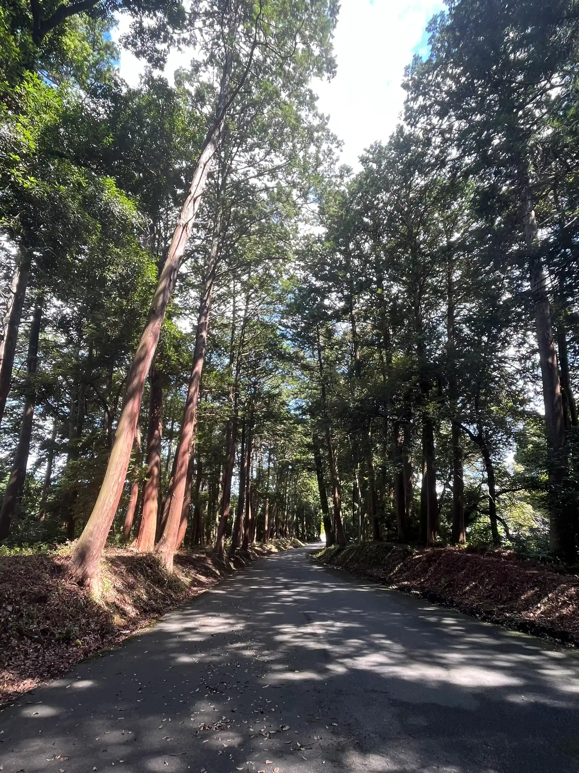 木漏れ日が射す、大きな木々の参道