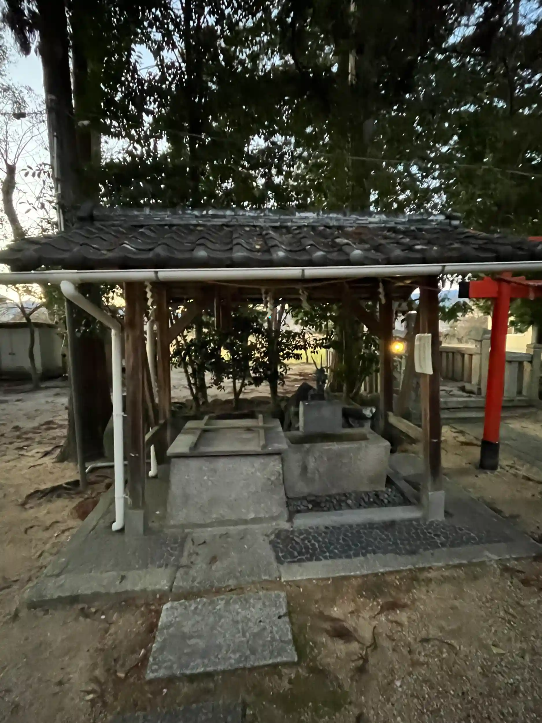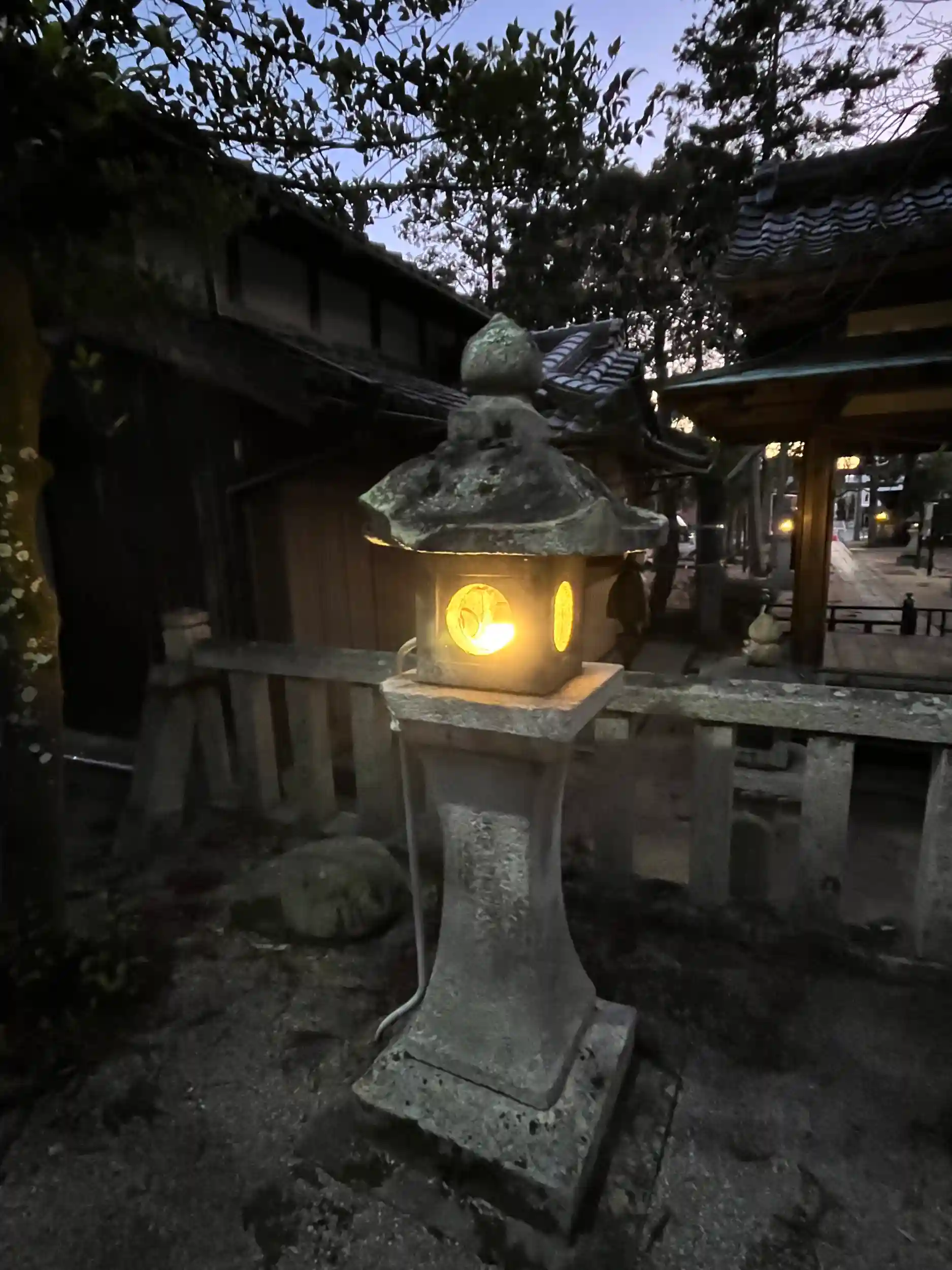 日の暮れで、境内の石燈籠に火が灯り、寒風で身が引き締まる中、何とも温かみを感じる神社さま⛩でした。