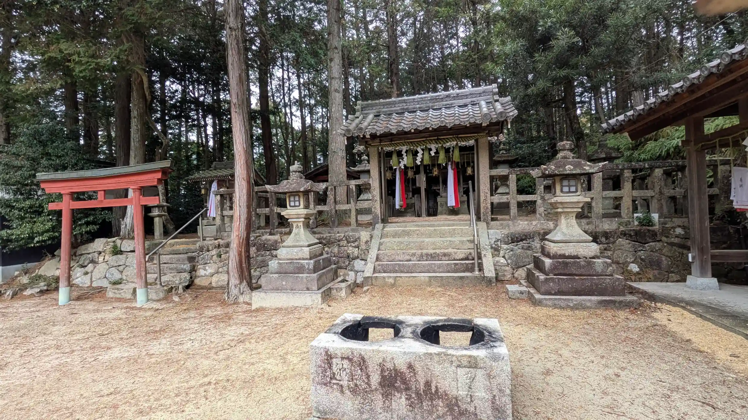 新免に入り、新宮神社へ。こちらも山麓で静かな境内。進んで行くと鳥居に朱の鳥居と神門があり、神門側が本殿のよう。社殿が二基あったのでどちらかが末社の樹下神社と思われるが扁額等表記はなし。朱の鳥居側にも二社あり左手前の小祠は「野神薬師如来」とあり御真言まで書いておりました。神仏習合が残された良き神社です。となると奥側にある小祠は稲荷さんかな?と思ってしまいますがこちらも表記なく詳細は不明です。各社お参りしてあとにしました。