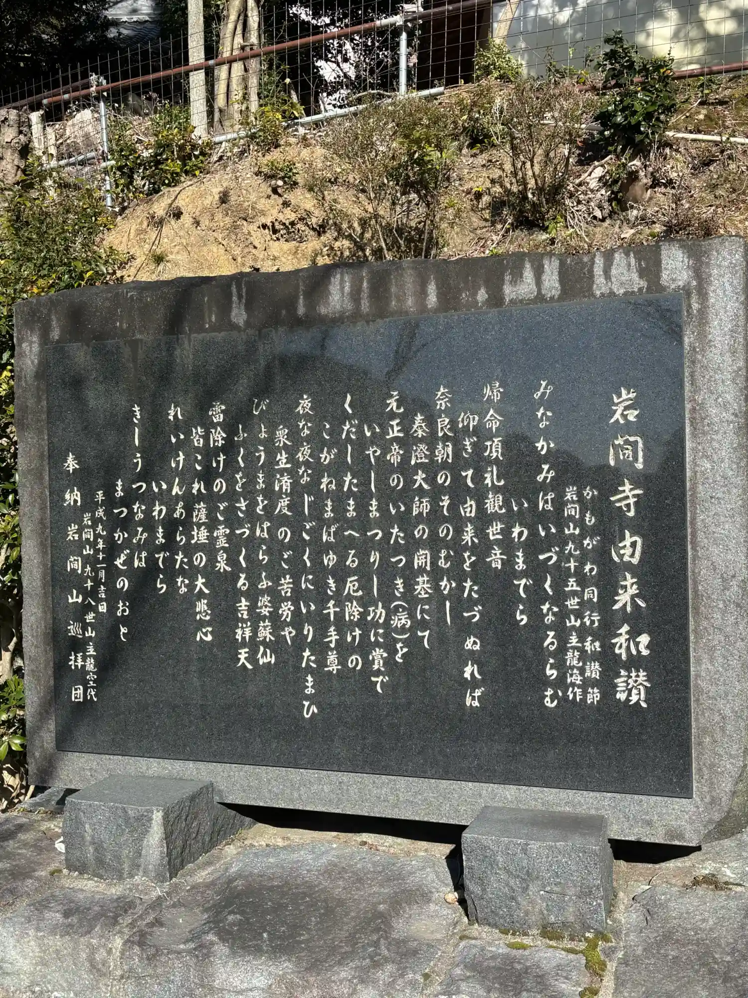 | ご由緒 | 滋賀県大津市と京都府宇治市の境にある標高443mの岩間山中腹に位置し、真言宗醍醐派岩間山正法寺(通称岩間寺)と称する。西国三十三所第十二番、ぼけ封じ近畿十楽 観音霊場第四番札所、びわ湖百八霊場湖西二十七古刹第二番。
