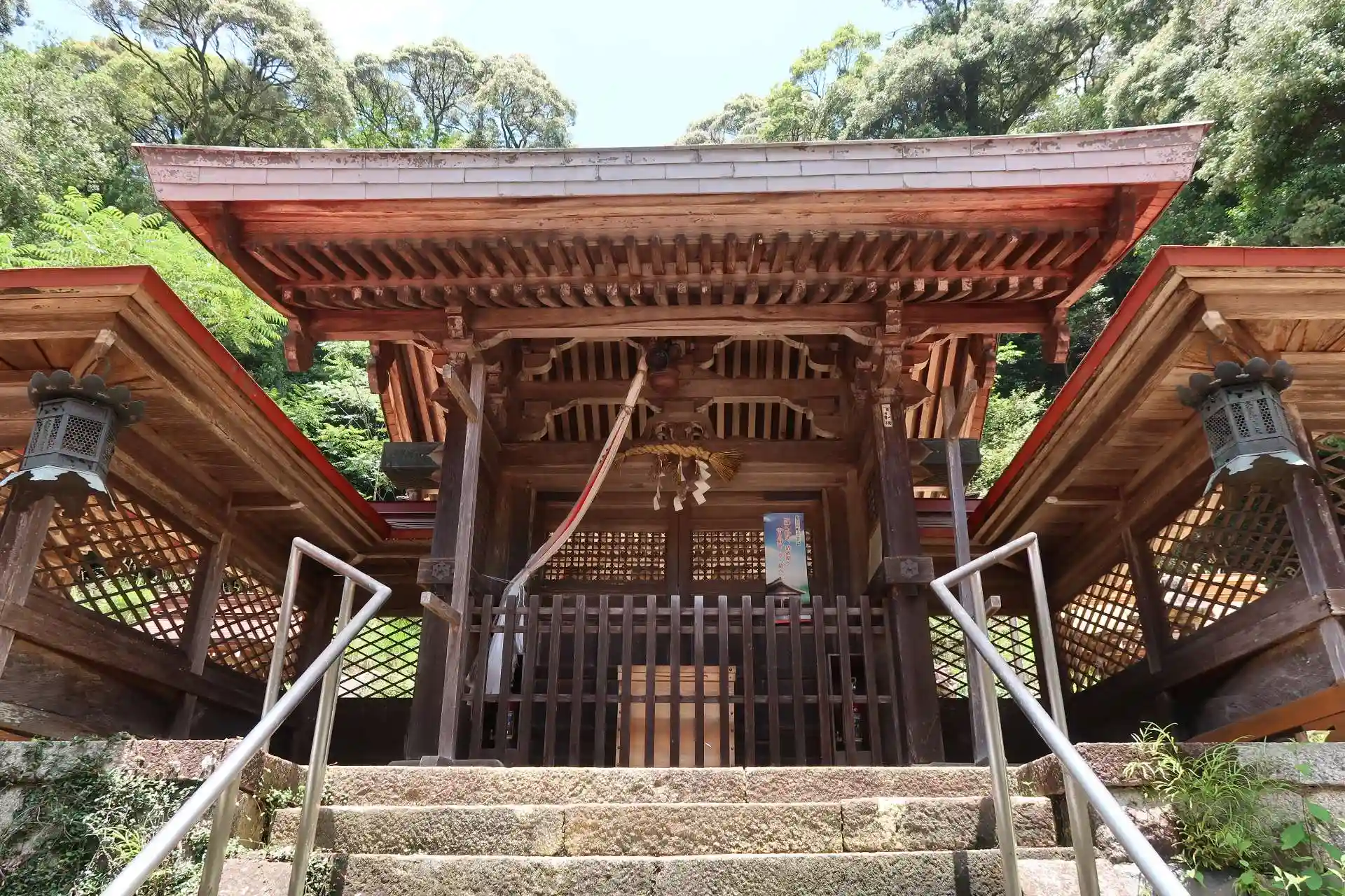 本殿の両側には境内社が1つずつありました。(社名不明) 本殿の屋根は桧皮葺で、確かに本殿の中央に柱がありました。