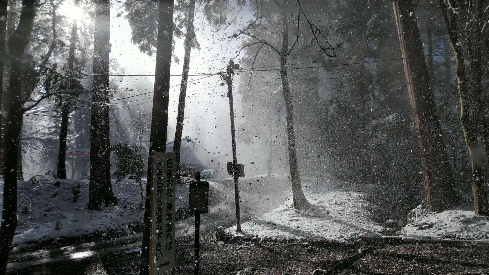 青空の下での降り積もった新雪に映える境内でした。