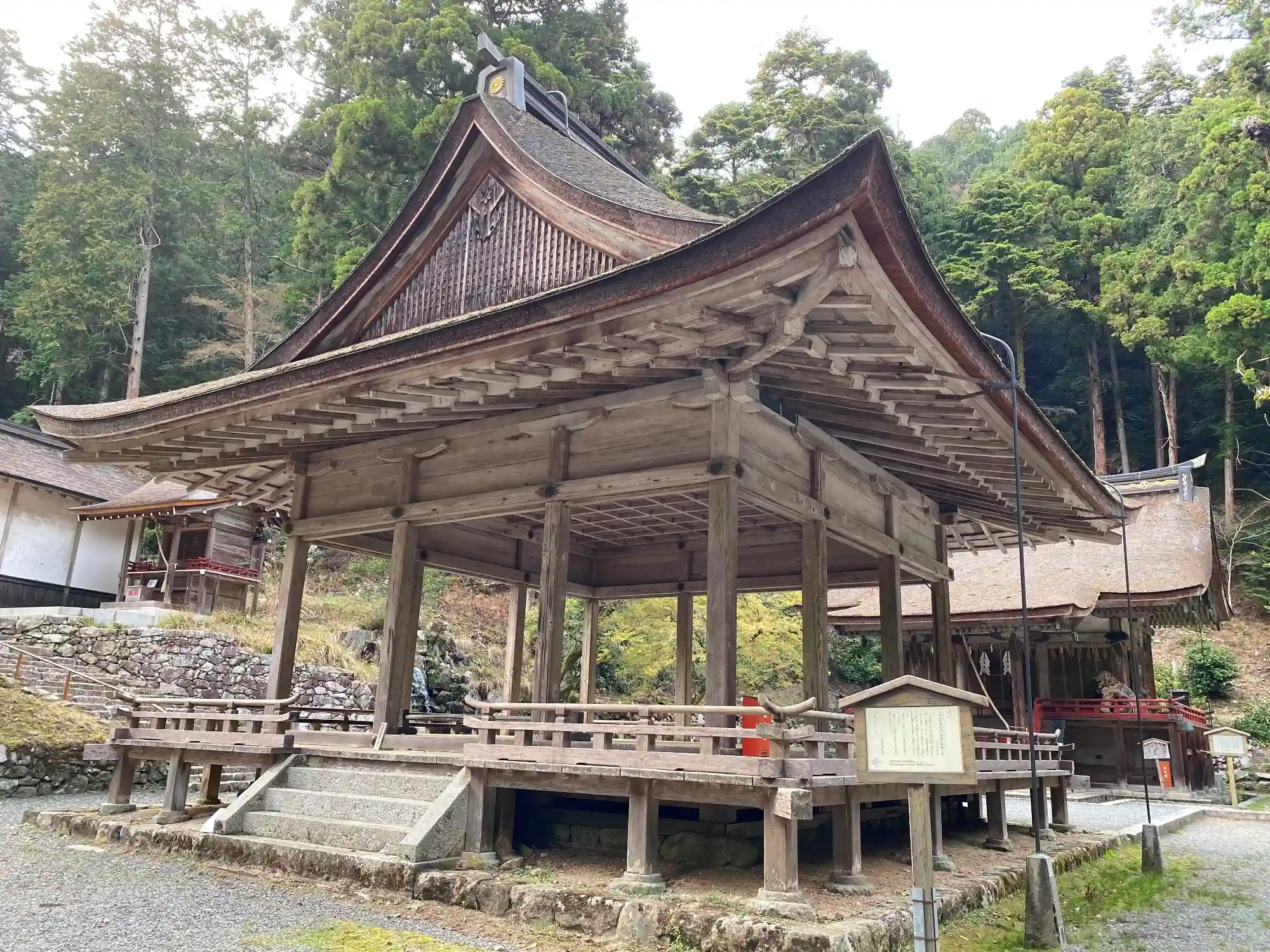 こちらが<拝殿>。こちらも壁がない様式。桁行三間、梁間三間、一重、入母屋造、妻入、檜皮葺。国指定の重要文化財。