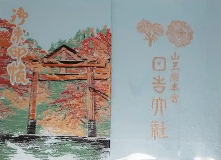 水色の地に、表面は紅葉に彩られた秋の山王鳥居がデザインされ、左上に御朱印帳の文字、裏面は上部に双葉葵(東本宮の神紋)と牡丹紋(西本宮の神紋)、その下に「山王総本宮 日吉大社」の文字が入っています。