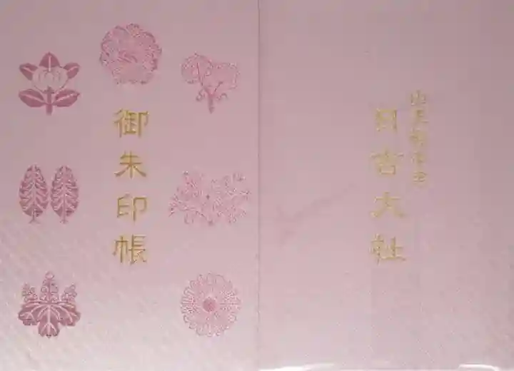 桃色の地に、表面は(上から時計回りに)牡丹紋、双葉葵紋、くずれ菊紋、十八葉菊紋、五七桐紋、二本杉紋、橘紋が入り、真ん中に御朱印帳の文字、裏面は真ん中に「山王総本宮 日吉大社」の文字が入っています。