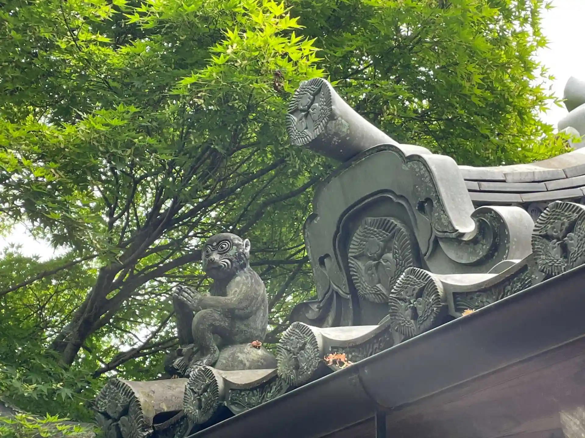 山門の瓦に猿が腰かけています。