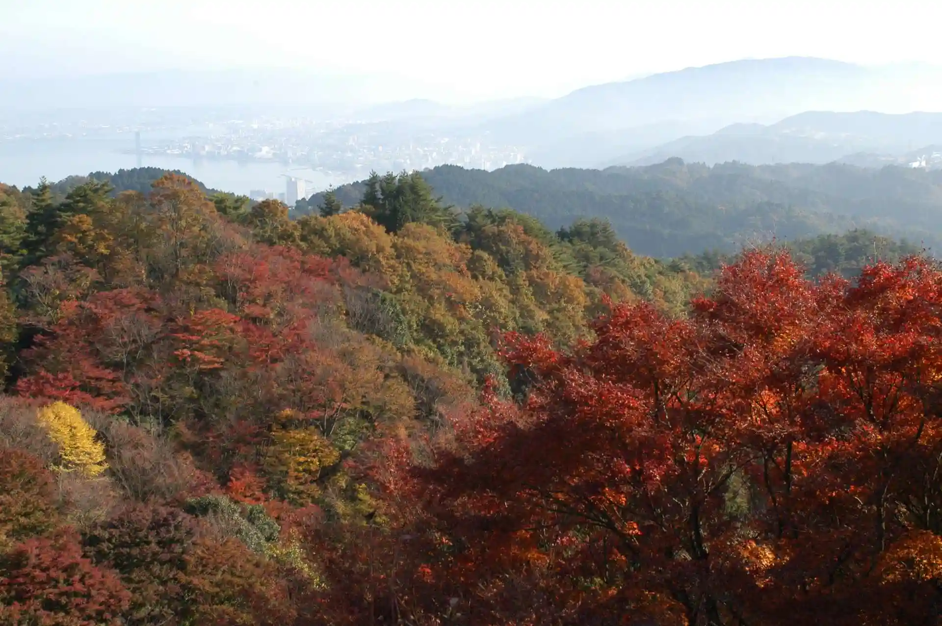 もみじの枝越しに眺望する京都や大津の街並み、びわ湖もまた格別です。