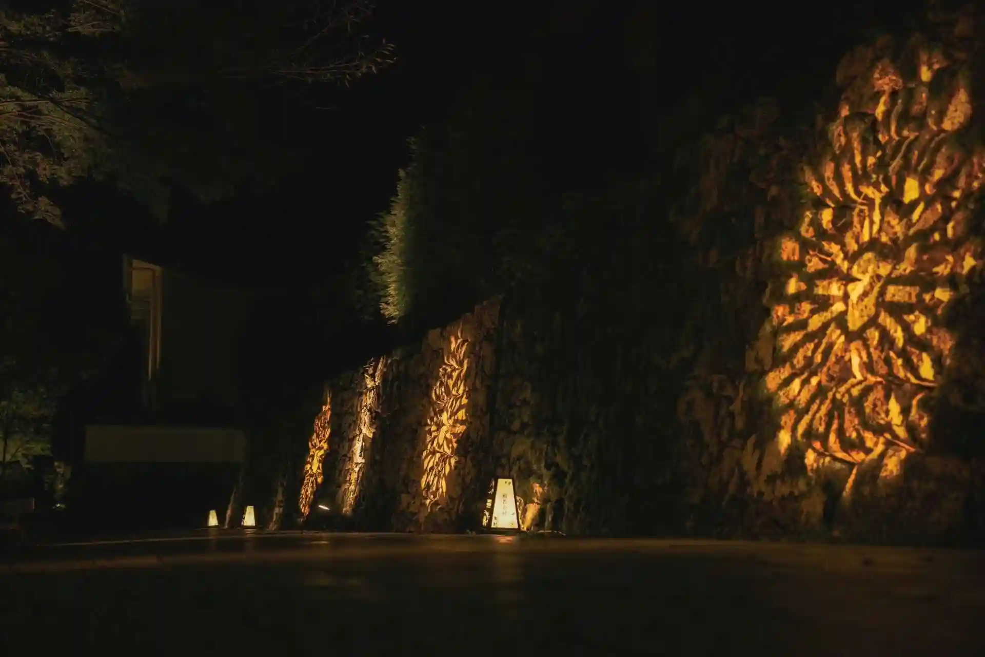 美しい穴太衆積みの石垣をたんぽぽ柄のコボライトでライトアップ。石垣を利用した壮大な光のアート。