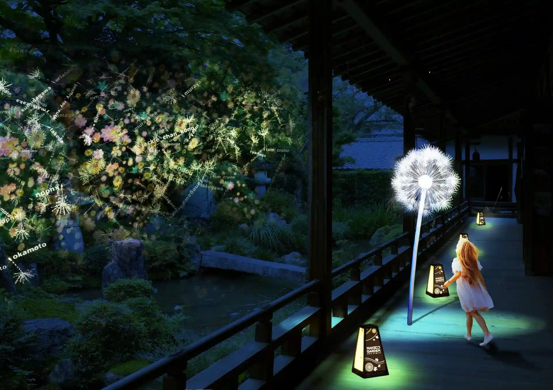 世界と繋がる参加型アート。スマートフォンをたんぽぽにかざすと、舞い上がった綿毛がネットワークを通じて世界に広がり、各地に花を咲かせる。開催時間は17:30~21:00(最終入場は20:30まで)。庭園ライトアップも楽しめる。