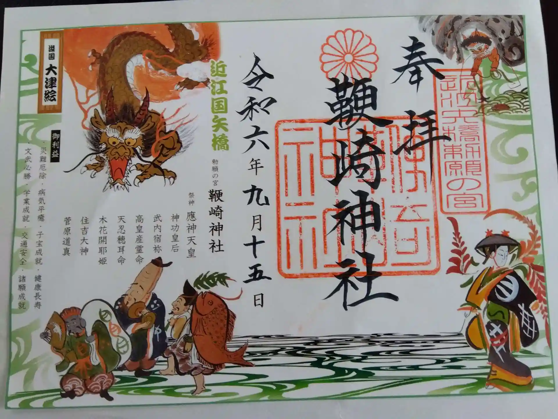 朱印紙には福徳円満・商売繁盛・えんむすびのご利益がある大津絵が描かれています。これは矢橋在住の大津絵絵師の先生が描かれた作品。
