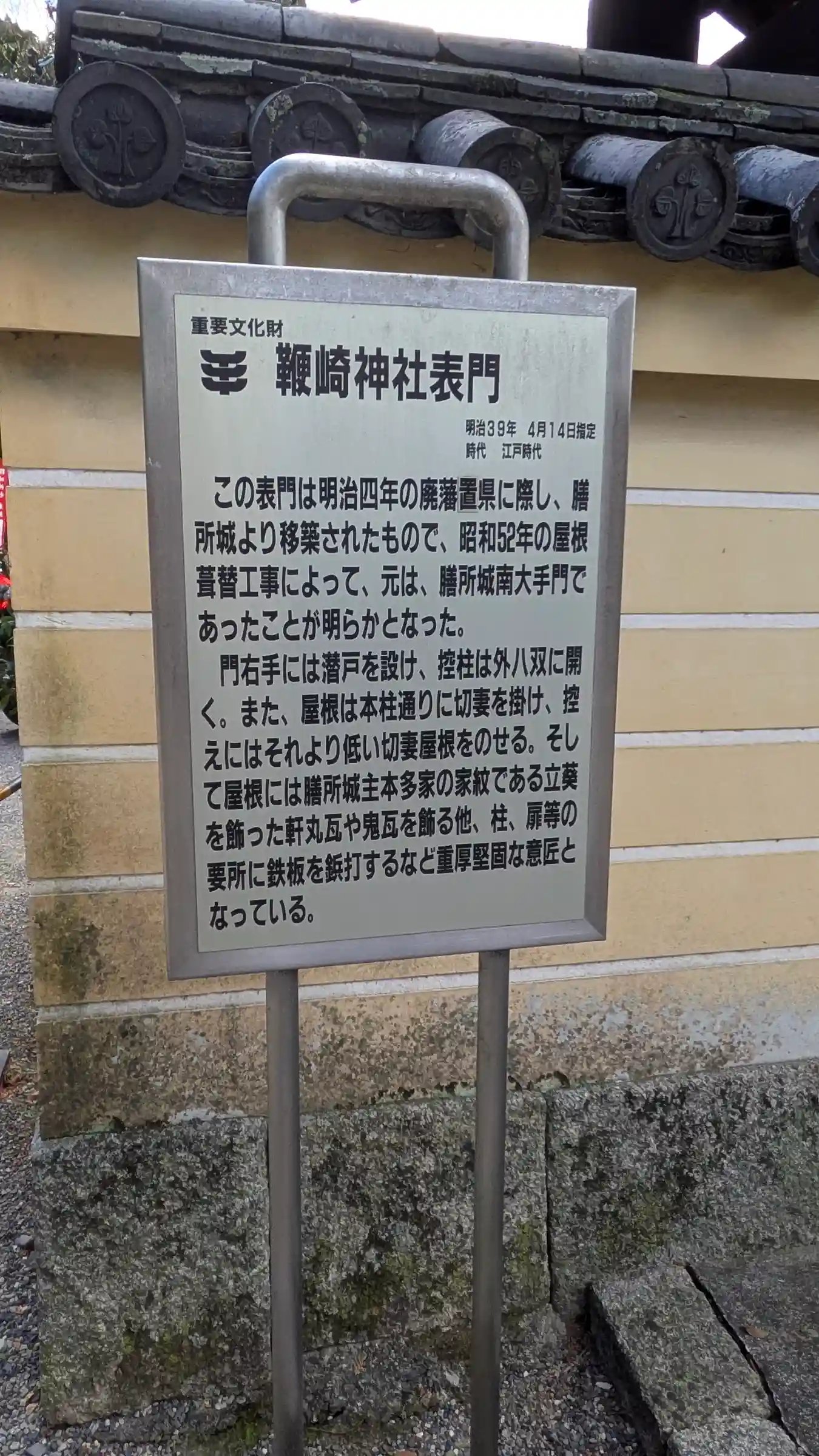 神社の表門は膳所城南大手門を移築したもので、国の重要文化財に…