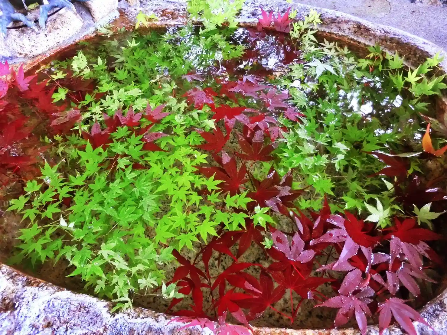 境内にあるモミジの葉で手水をいろどりました。