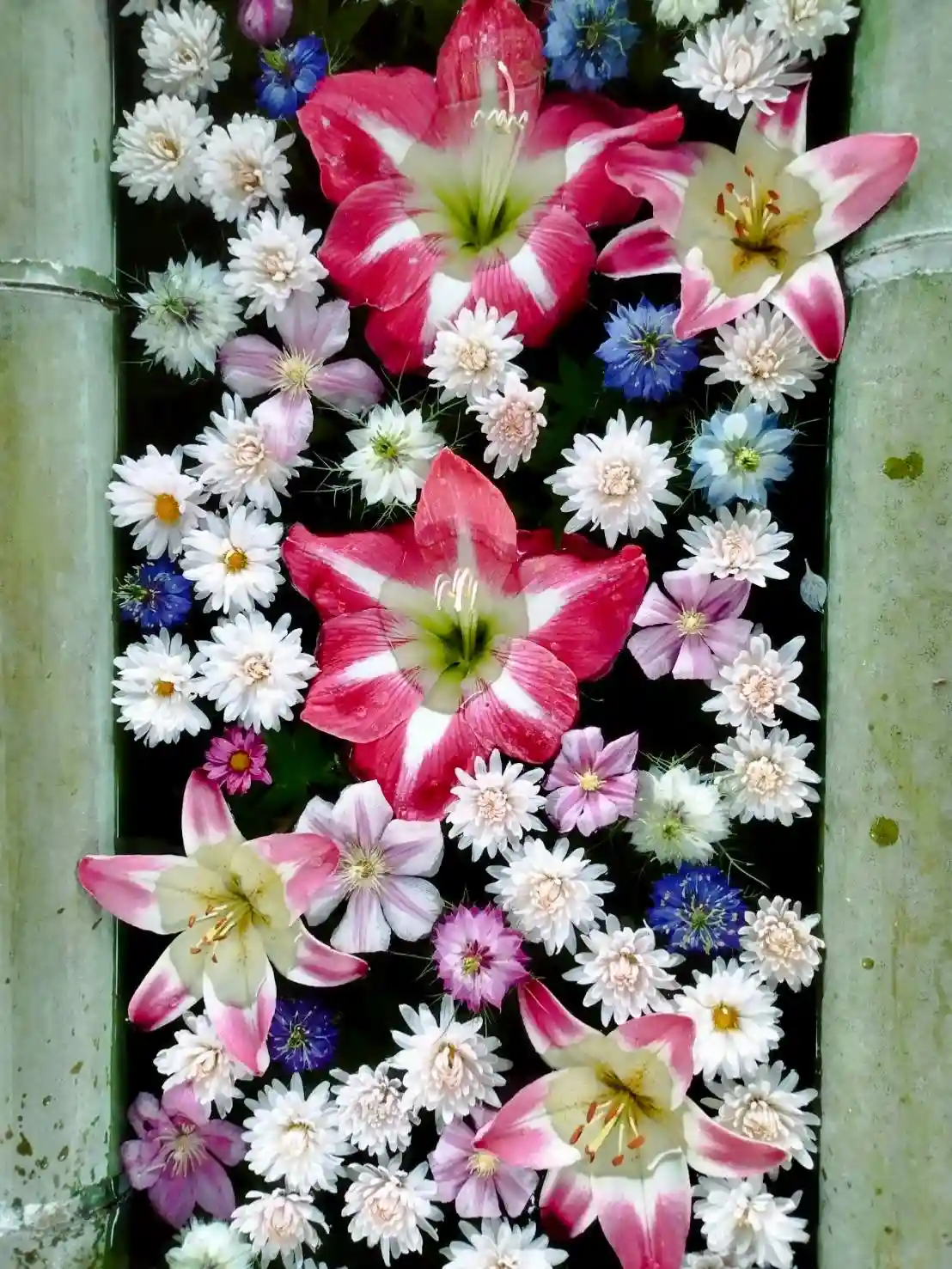 花手水には、氏子さんから奉納していただいたアマリリス、百合、ニゲラと菊を入れています🌸