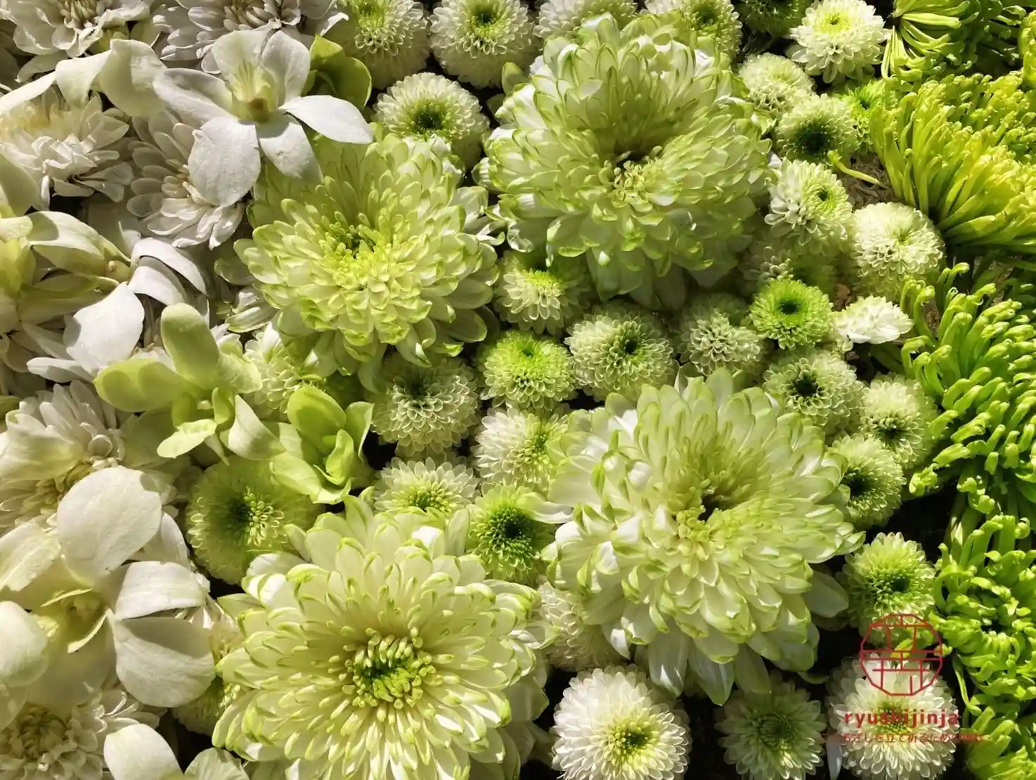 辰をテーマに濃い緑色から白色へとグラデーションに変わる花手水で表現しています🐲
