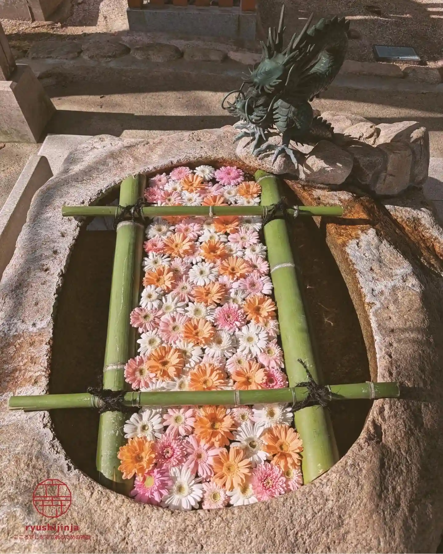 花手水は、鮮やかに水面を彩る色とりどりのガーベラのお花です。