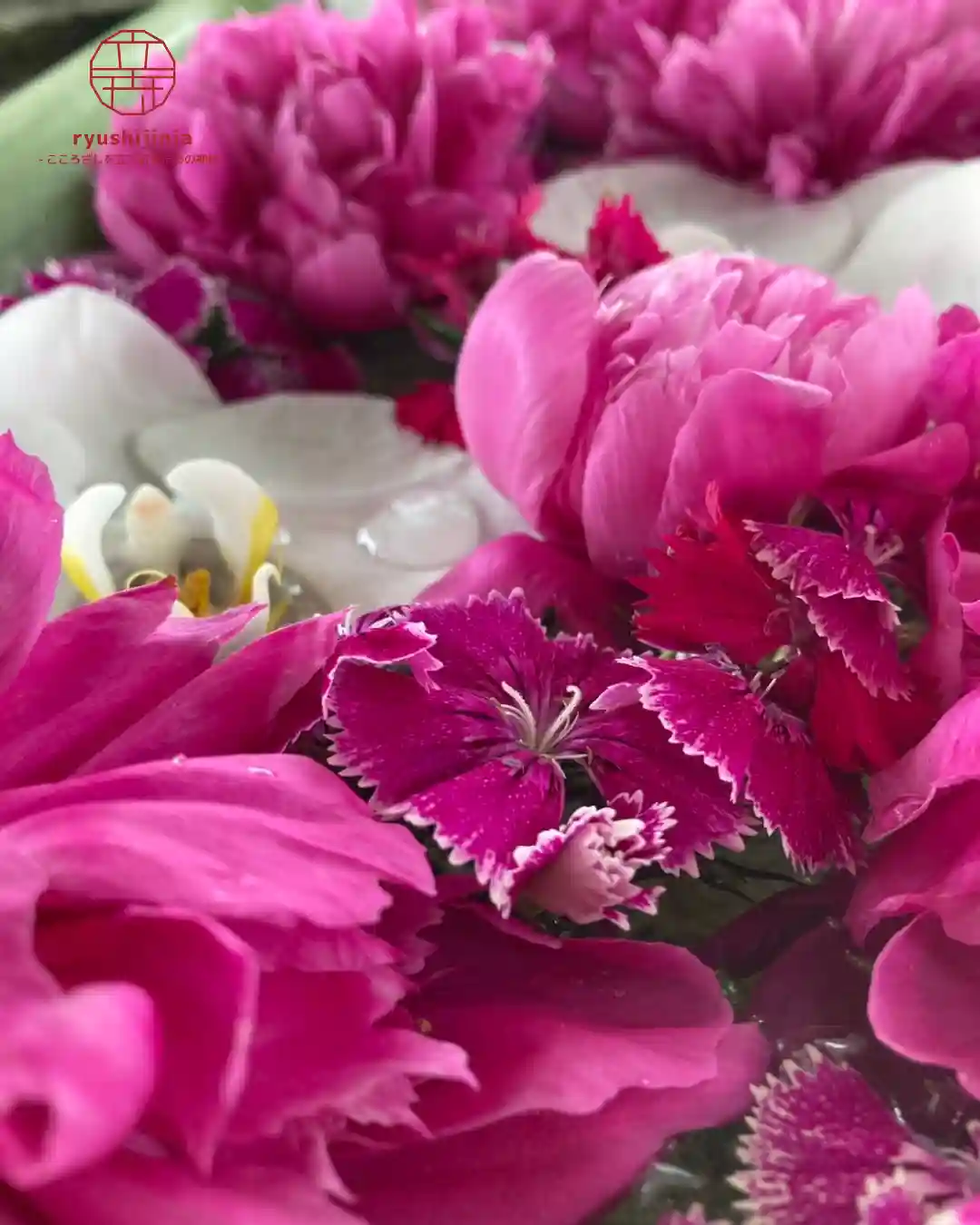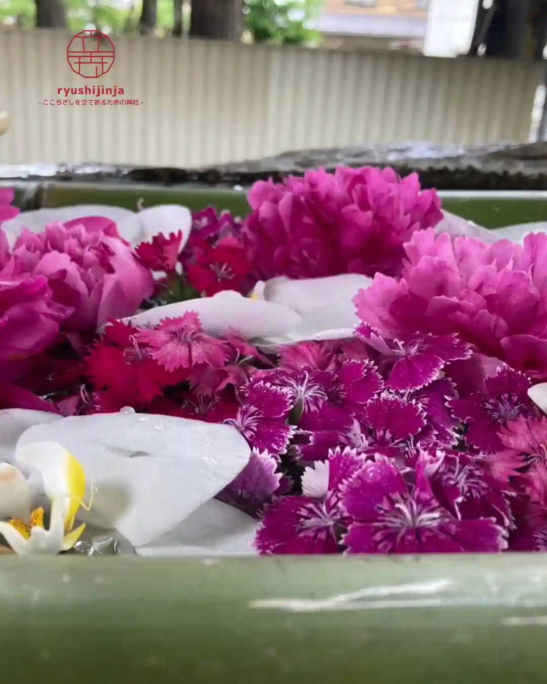 花手水は芍薬と胡蝶蘭、ナデシコで彩っています🌸