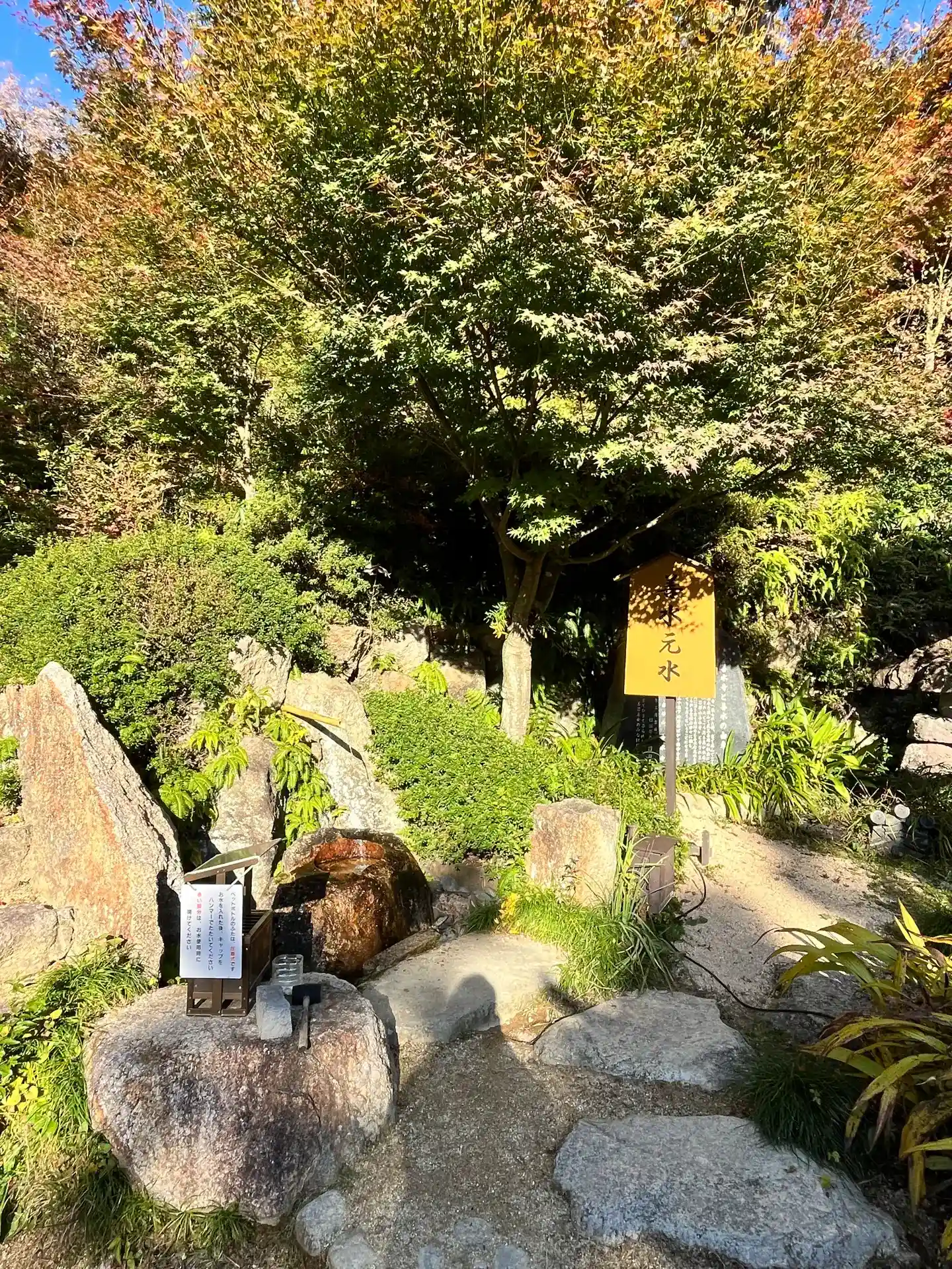 百伝池の東側に湧出している水(善水元水)は地下50m程の井戸を掘り汲み上げているもので、3度目の井戸の設置できれいな水が出るようになったそうです。