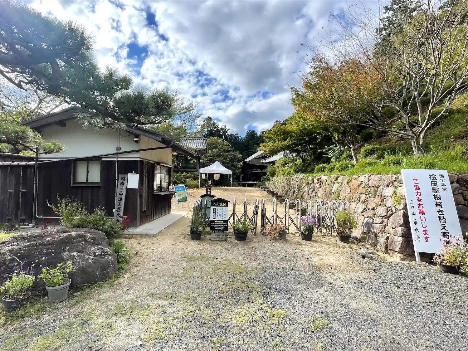 善水寺〜駐車場からの入口、奥に白く見えるのが工事中の本堂(国宝)