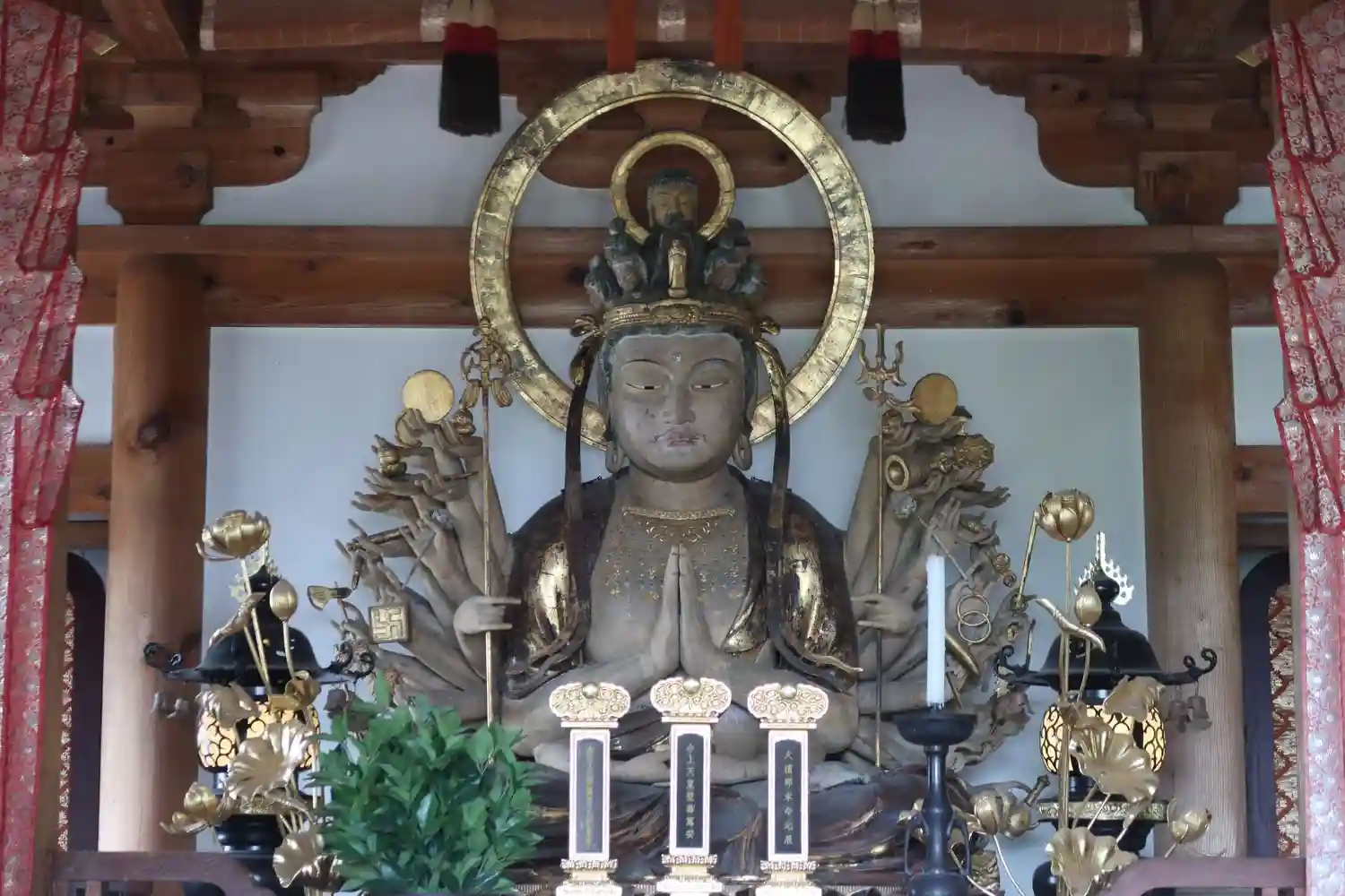 開山堂内の垂れ幕には本尊の十一面千手観世音坐像が載っています。